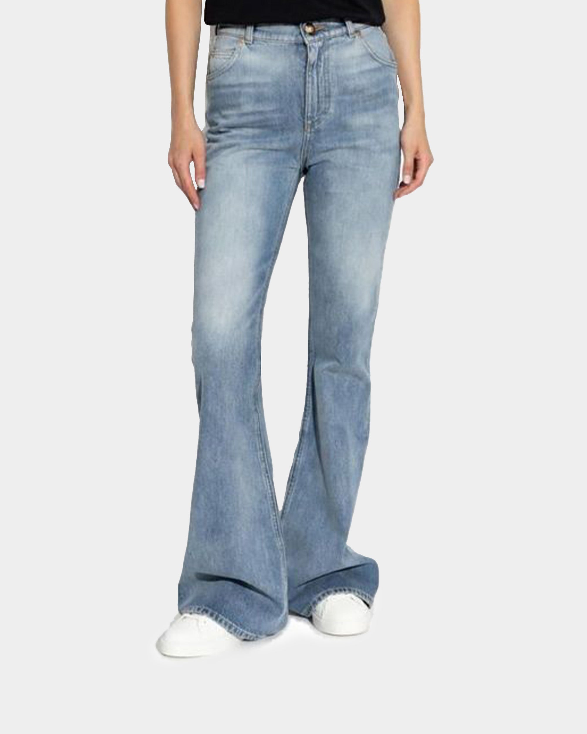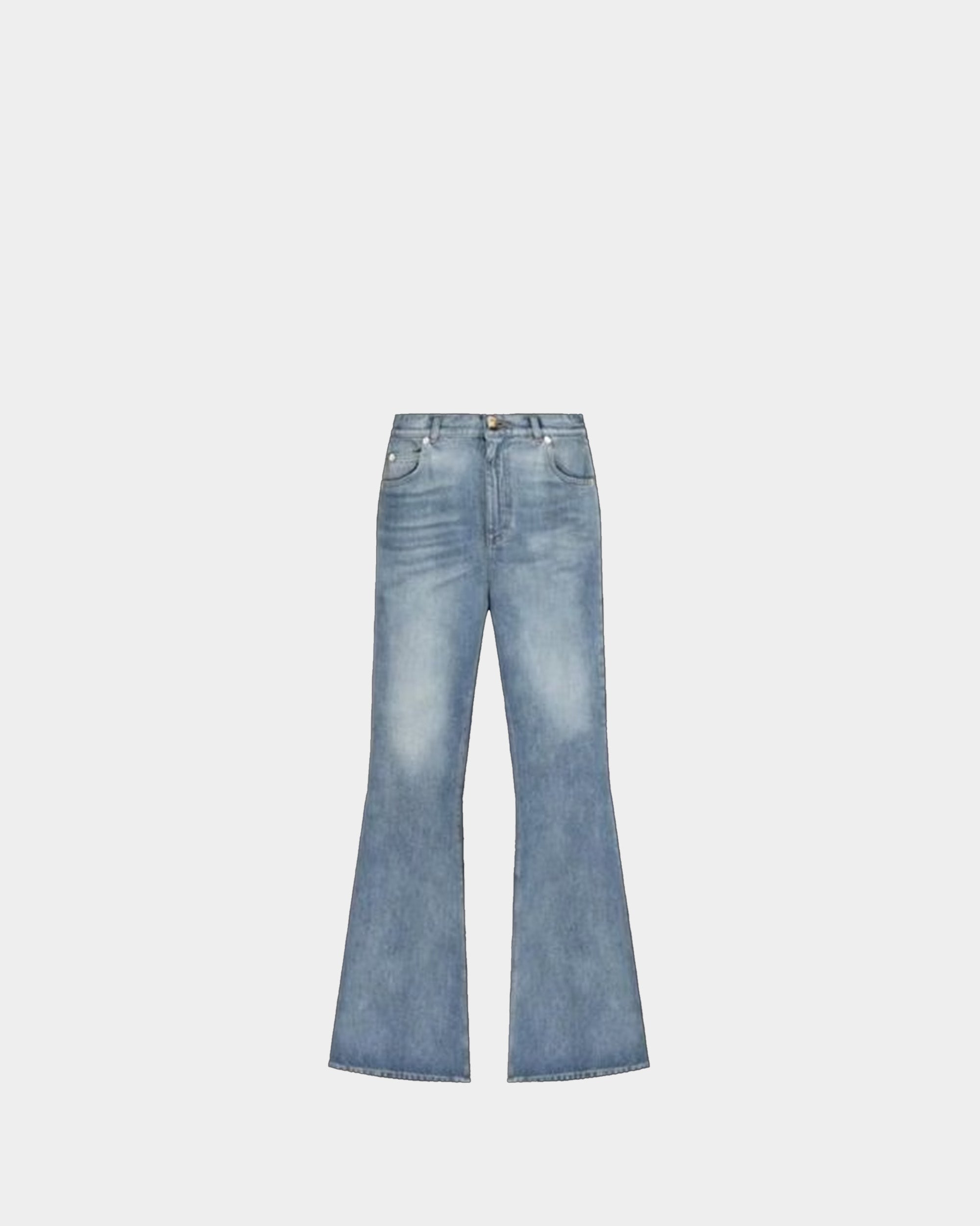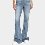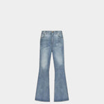 以復古剪裁詮釋當代風格,這款牛仔褲以淺藍色漸層刷色搭配喇叭褲型,營造修長比例與俐落線條。前後口袋設計實用且保留經典細節,適合搭配襯衫或針織上衣,展現優雅與率性並存的氛圍。