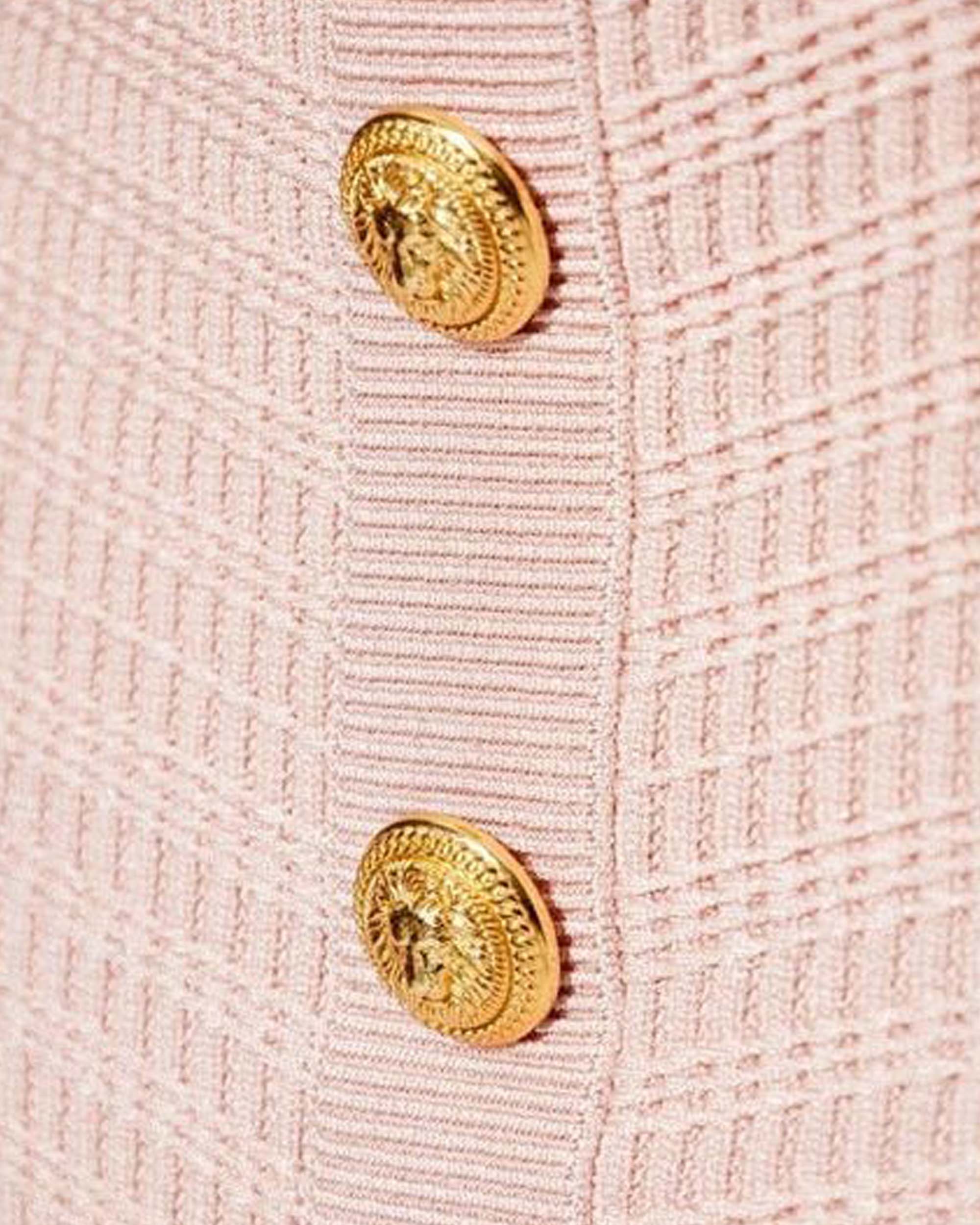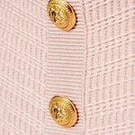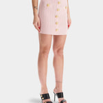 經典修身剪裁短裙,以高彈力針織面料勾勒身形曲線,中央飾以標誌性金色獅頭鈕釦,展現品牌一貫的挺版氣勢與女性輪廓之美。柔和粉色調賦予整體造型俐落中帶有溫柔感,適合搭配同系列針織上衣或西裝外套。