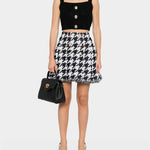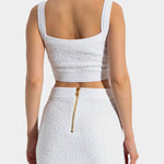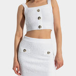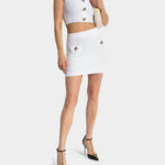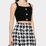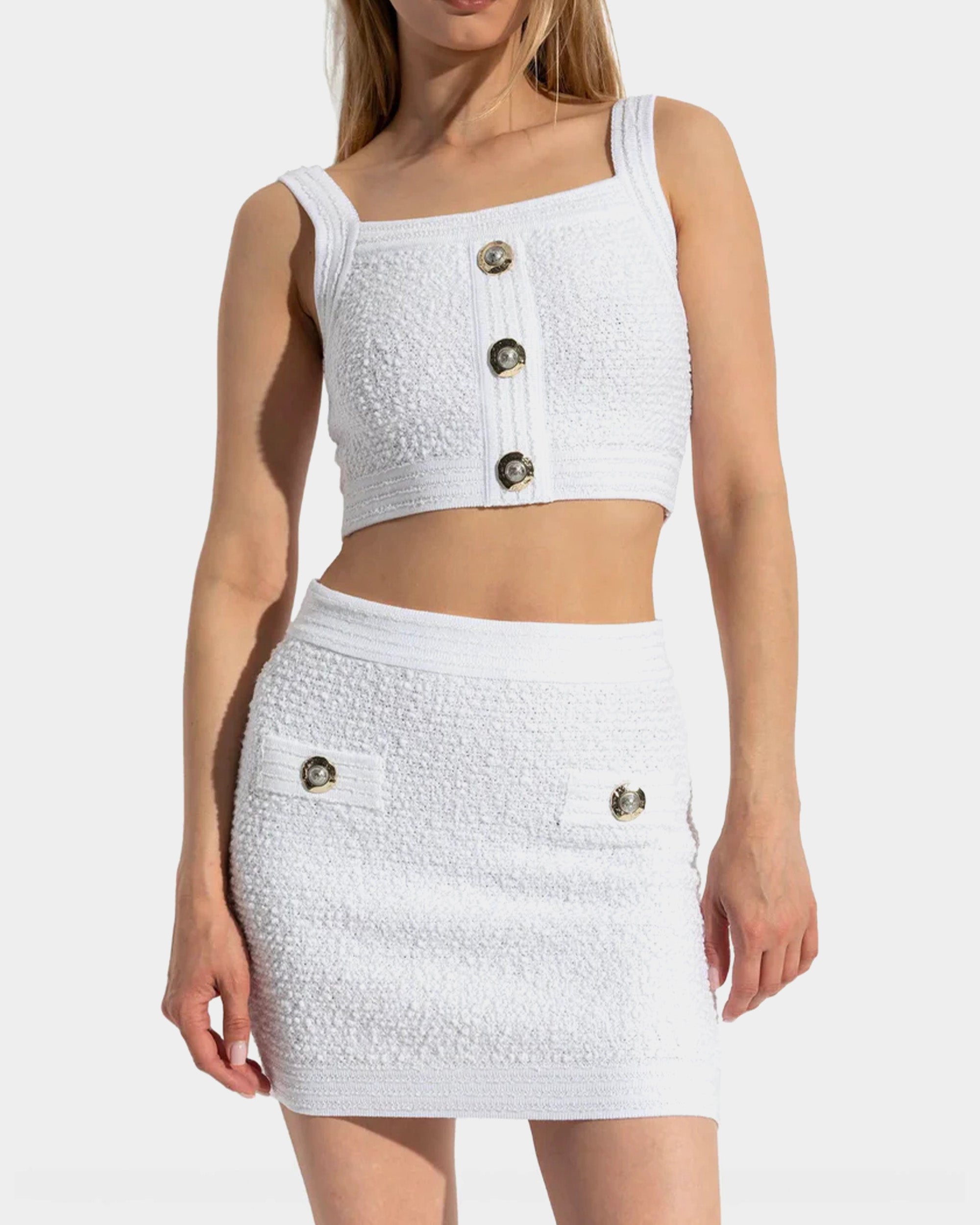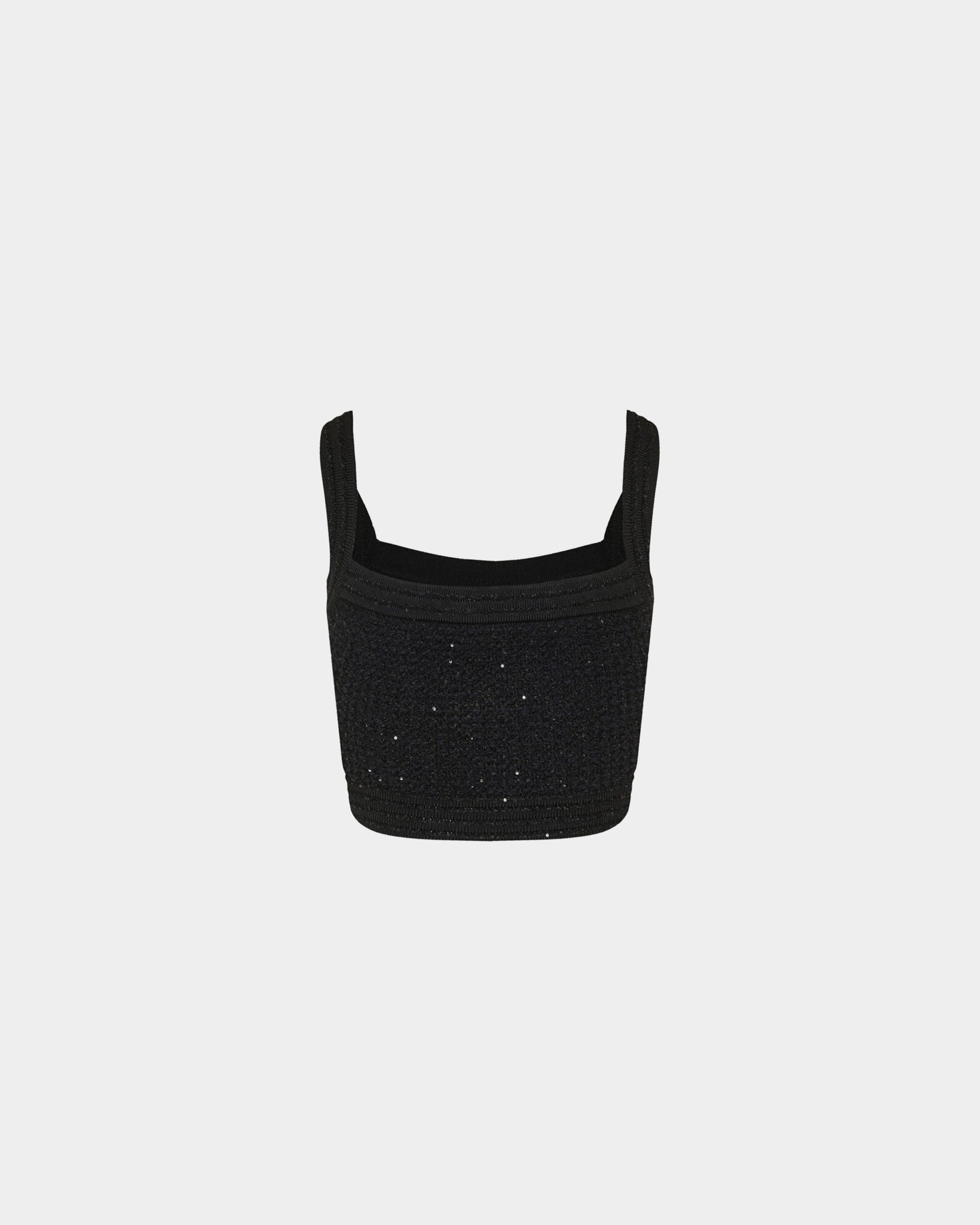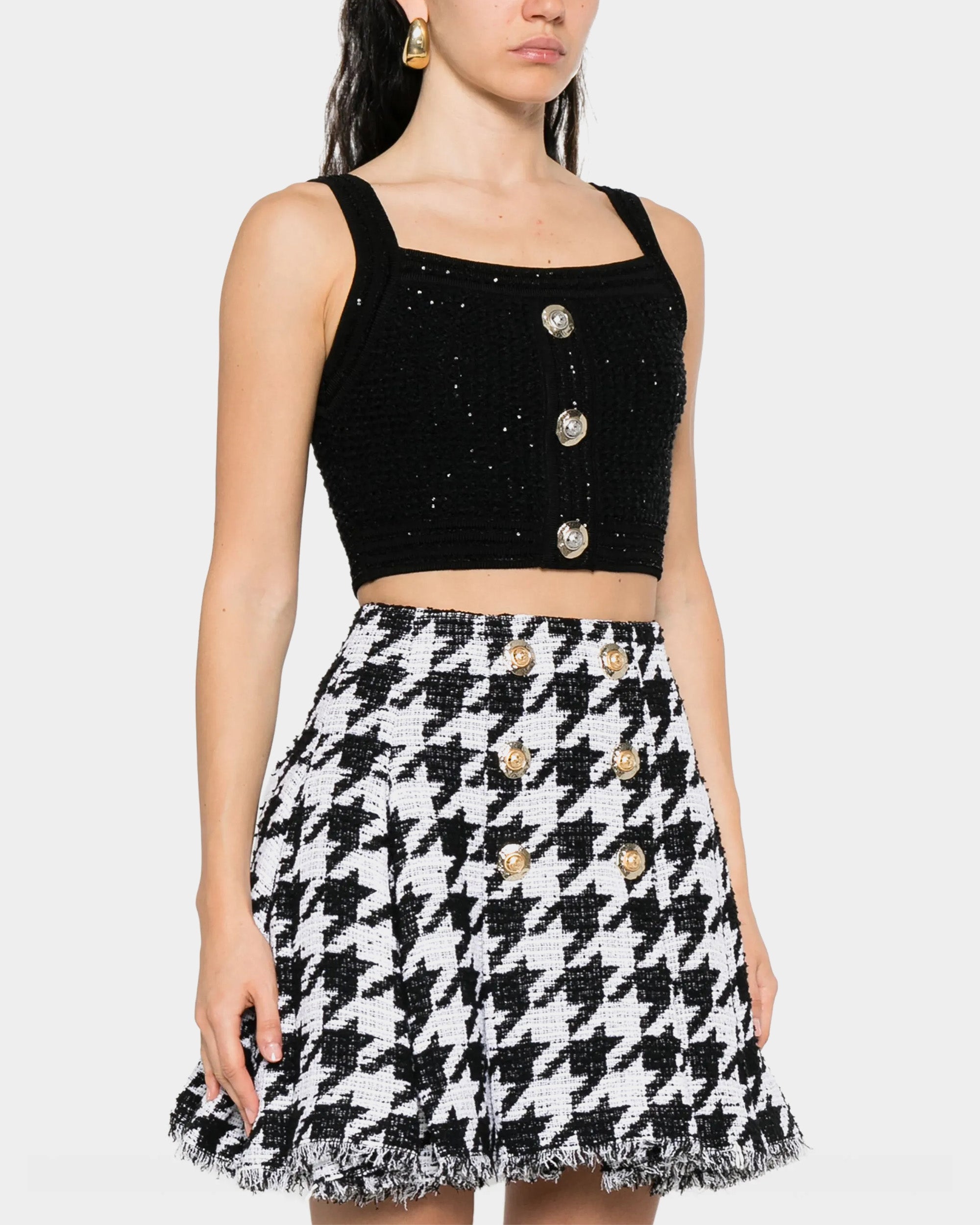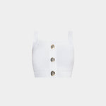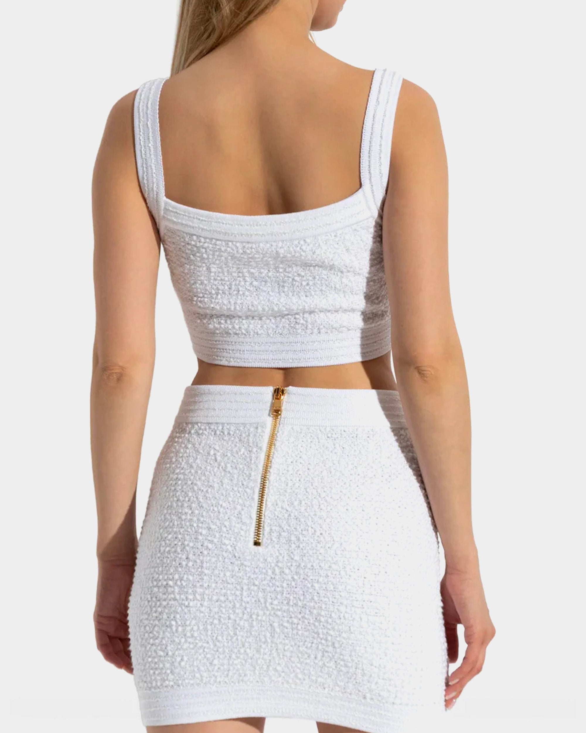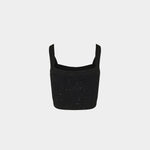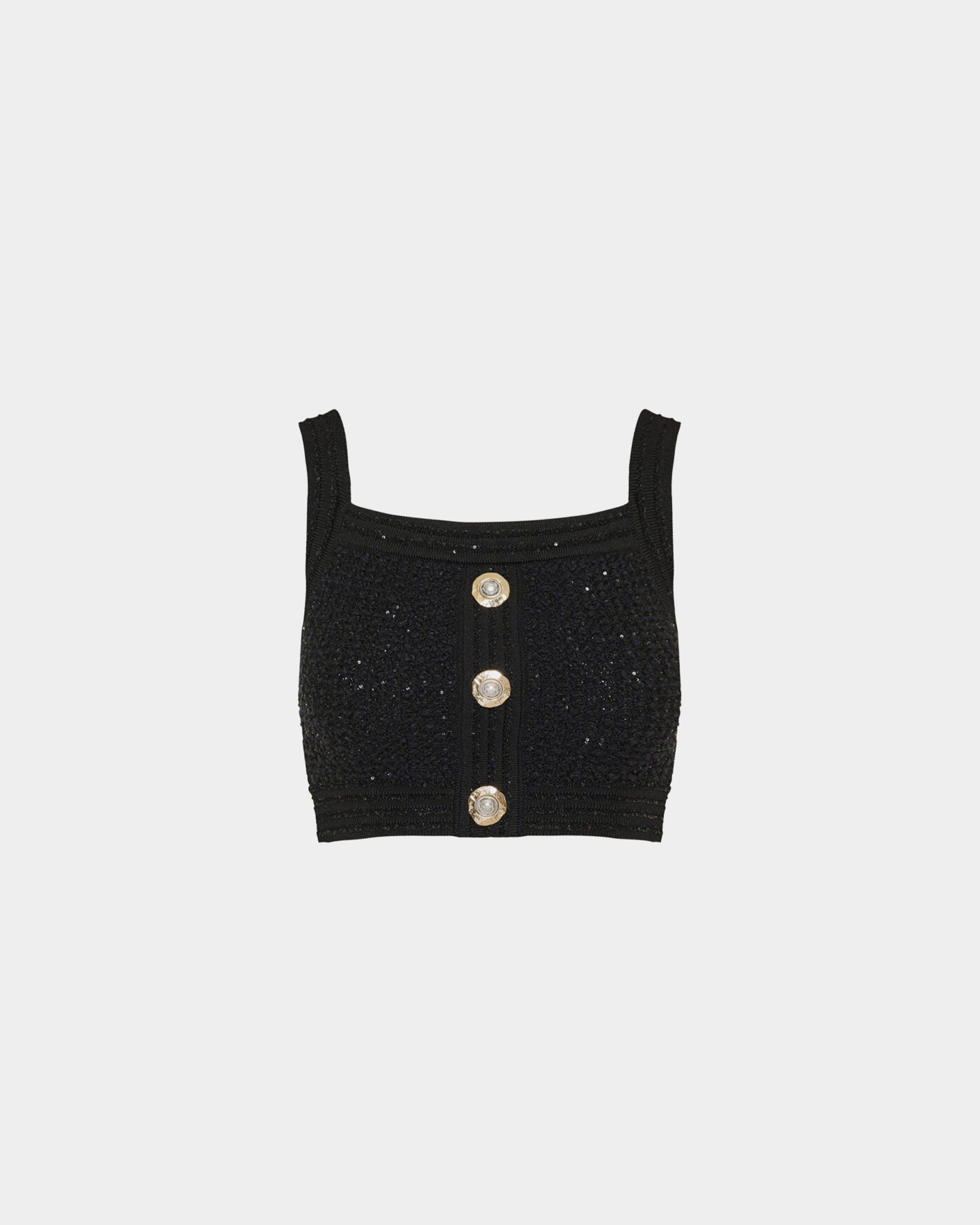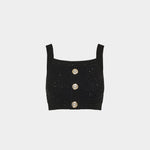 以挺的針織布料製成,短版設計凸顯俐落比例。方形領口搭配寬肩帶,展現簡約大方的線條感。前排飾有 Balmain 經典金色徽章釦,增添品牌辨識度。適合單穿或搭配高腰下裝,營造時尚摩登造型。