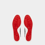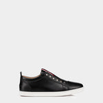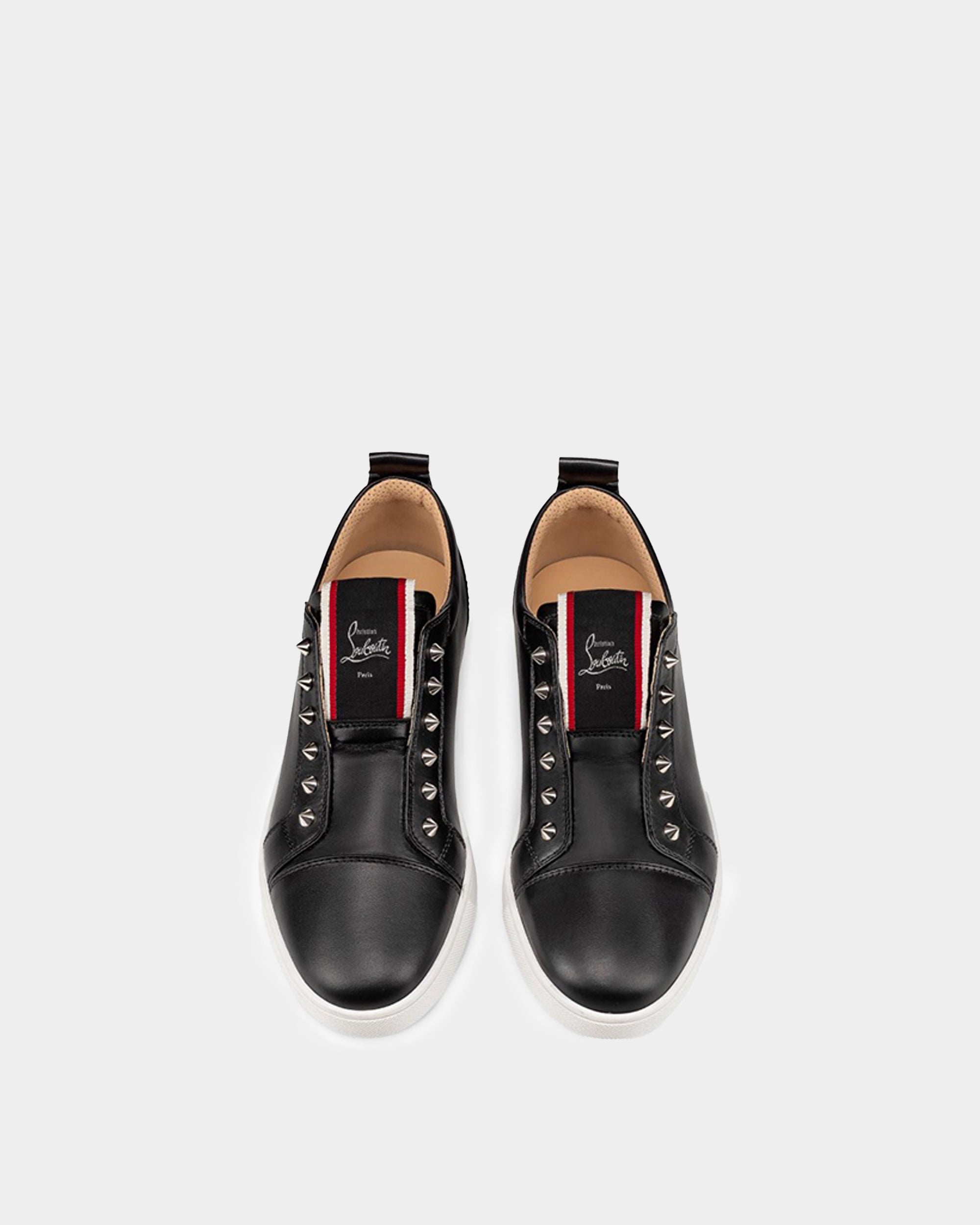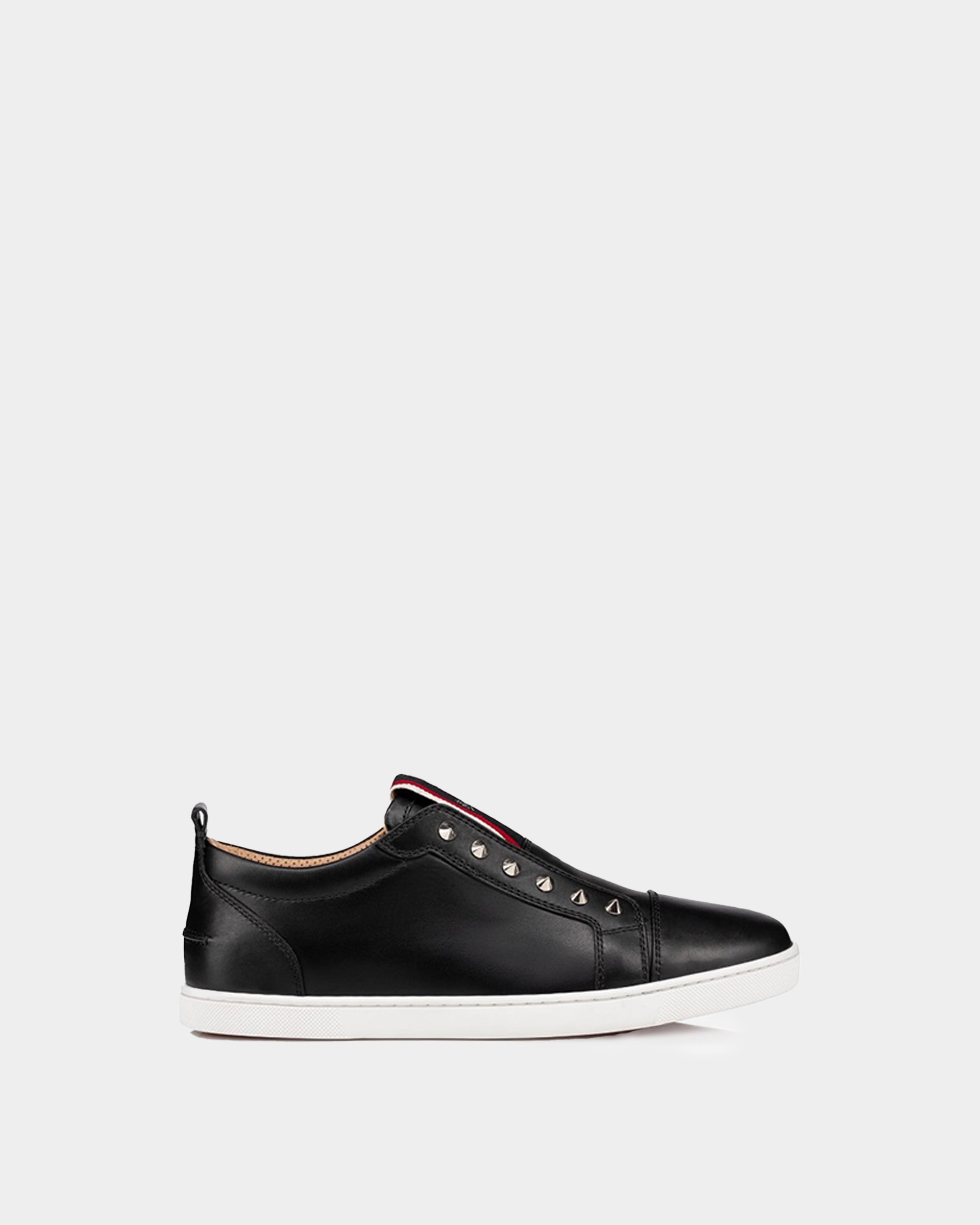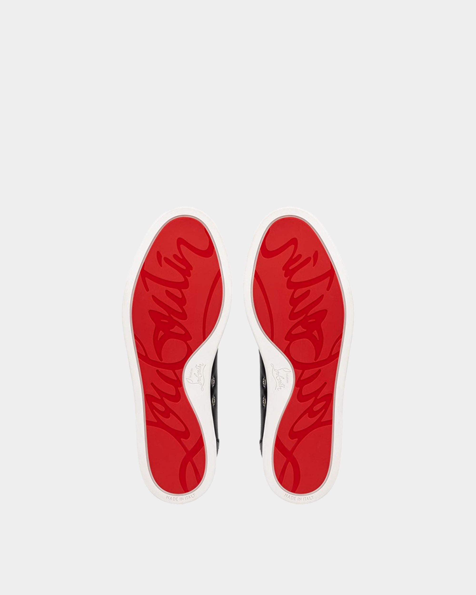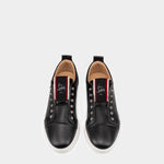 黑色鉚釘小牛皮鞋為 Christian Louboutin 經典街頭風格代表作,融合時尚與實穿。無鞋帶設計搭配金屬鉚釘與紅黑白條紋布標,不僅易於穿脫,更展現品牌叛逆風格。標誌性紅底強化品牌辨識度,是日常穿搭與街頭風格的完美配件。