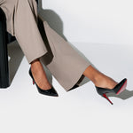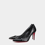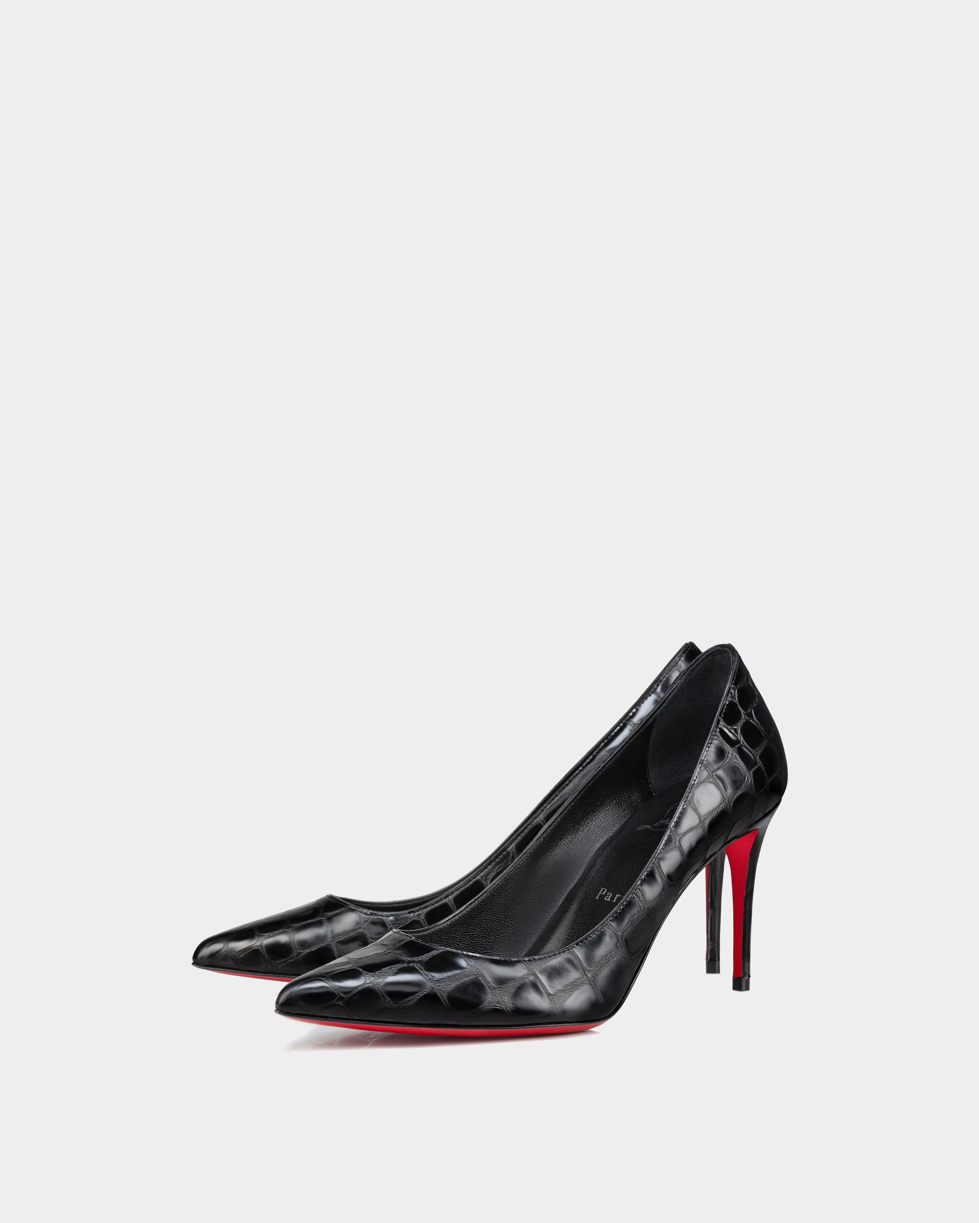 經典「Kate」系列高跟鞋以俐落優雅的線條著稱,此款採用黑色鱷魚壓紋小牛皮製成,結合尖頭與85mm高細跟,塑造纖長腿部線條。標誌性紅底展現品牌精神,無論是日常穿搭還是正式場合皆完美駕馭。