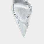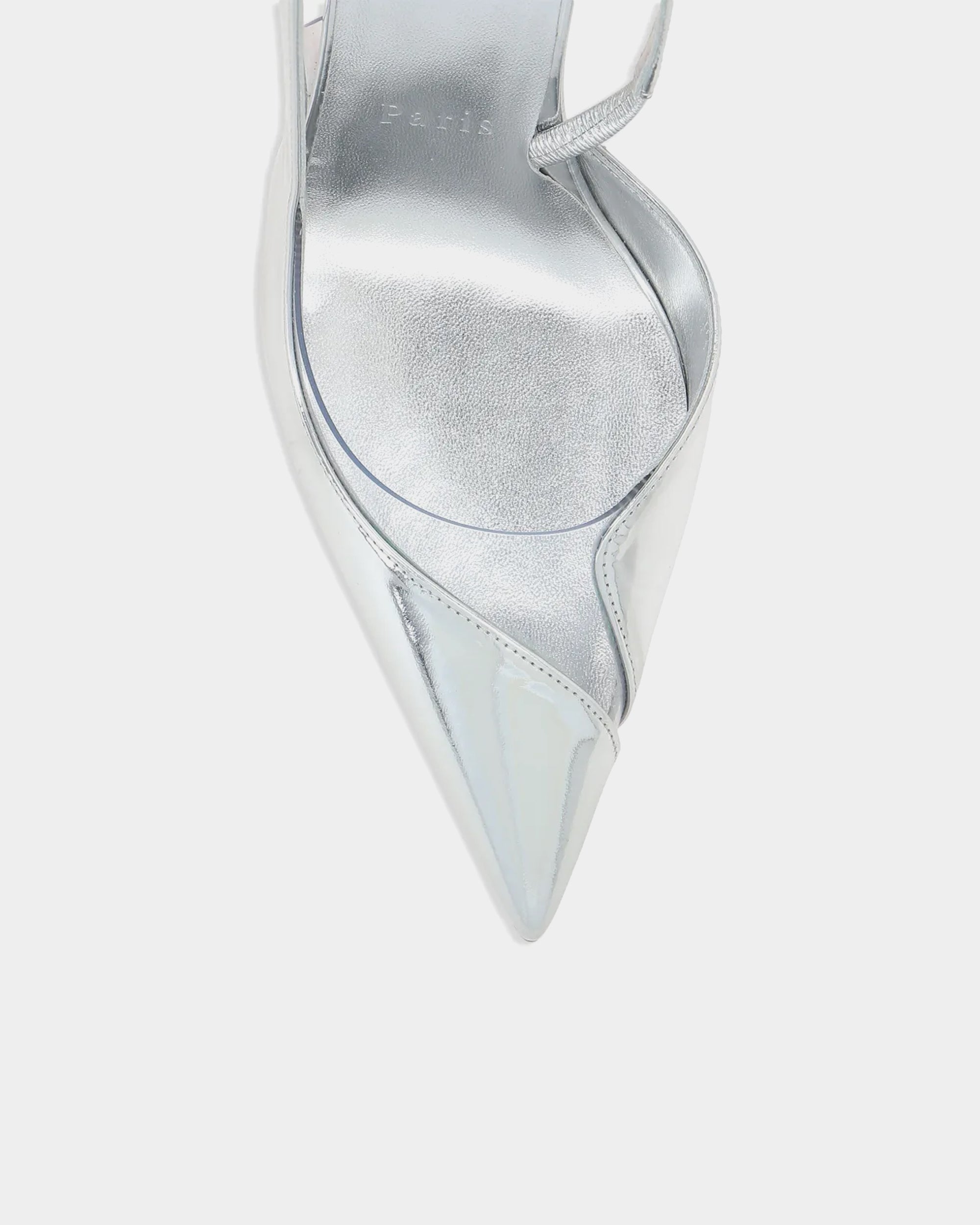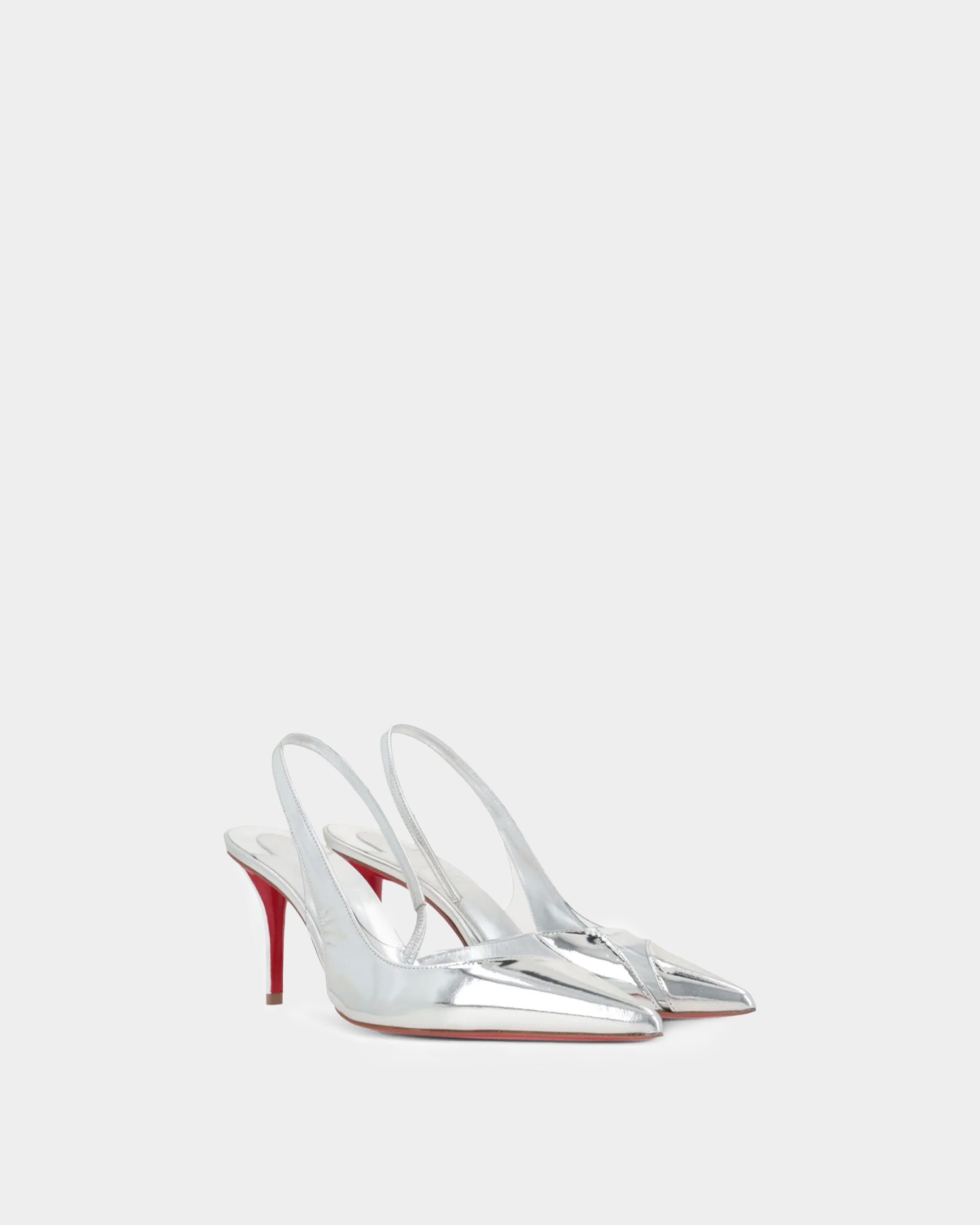 Posticha 銀色高跟鞋結合極具未來感的鏡面質感與經典尖頭設計,展現俐落自信風格。鏡面小牛皮鞋面光澤閃耀,搭配品牌標誌性紅底與 8cm 跟高,既舒適又具時尚張力,是日夜穿搭皆宜的百搭單品。