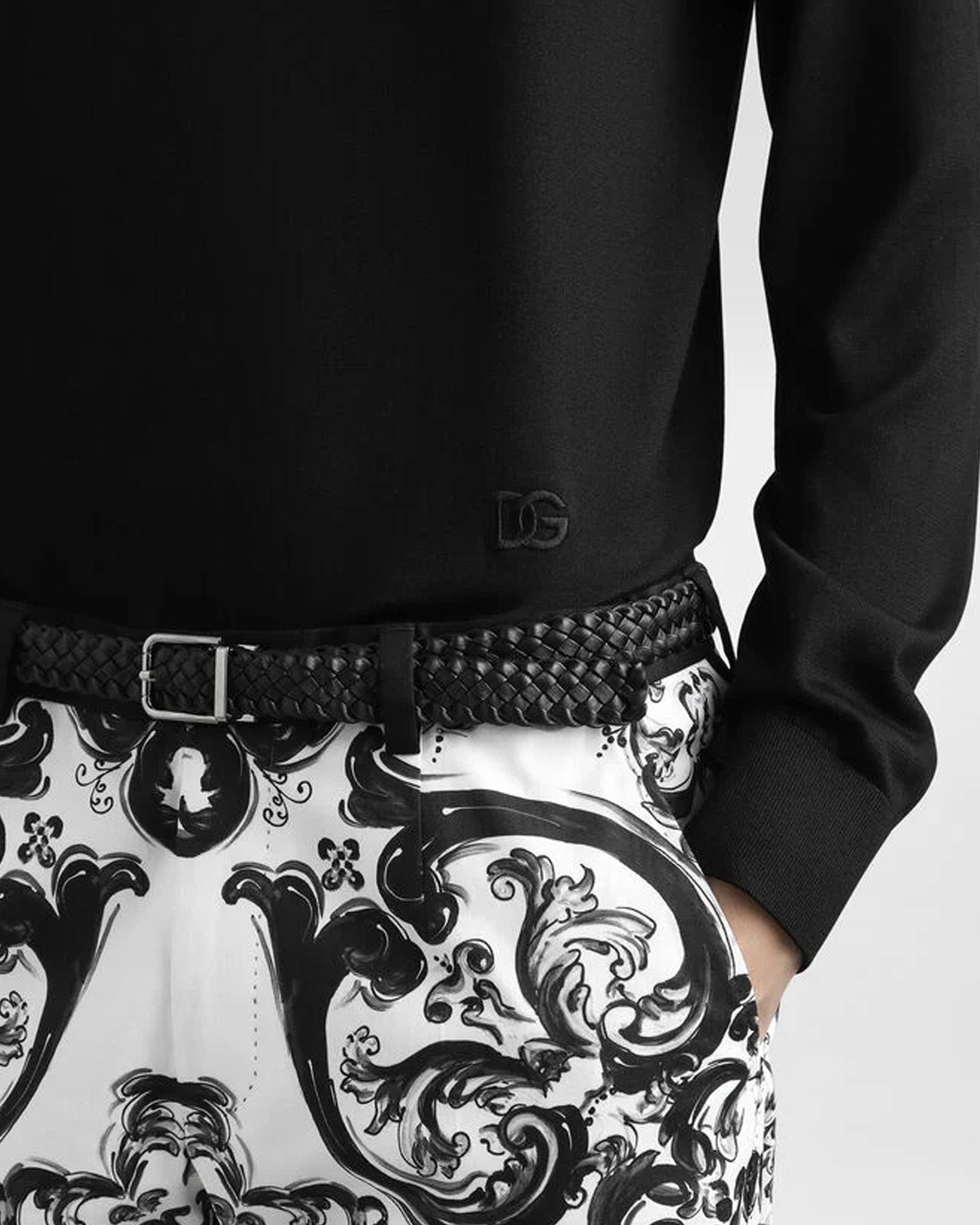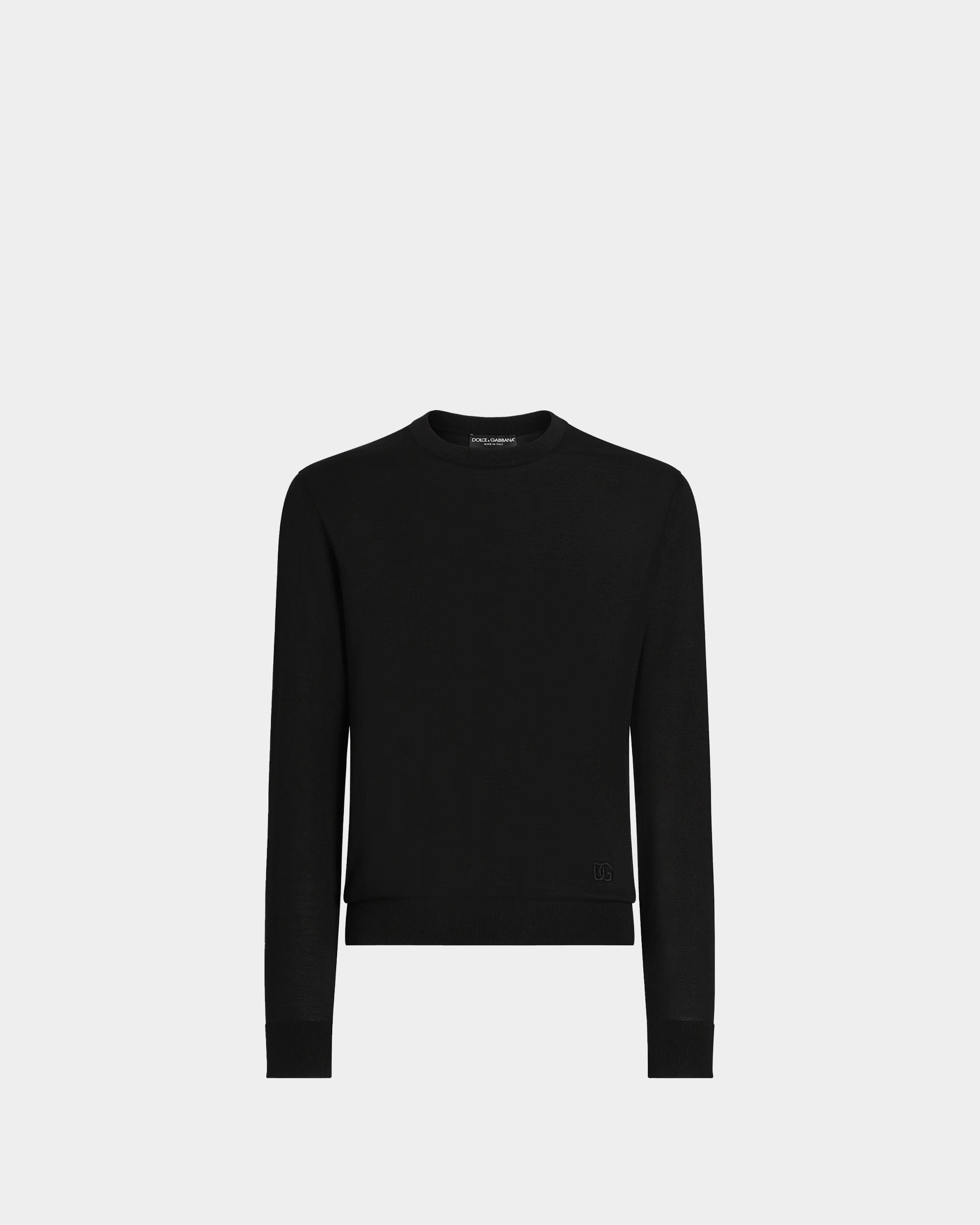 以黑色真絲打造,質地柔滑輕盈,展現極簡優雅的設計風格。下擺與袖口採彈性羅紋收邊,搭配低調 DG 刺繡標誌,適合正式或休閒穿搭,體現高級質感。