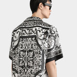 呈現華麗對稱的巴洛克風格印花。採用真絲斜紋面料,帶有自然光澤與滑順觸感,短袖設計與開領剪裁,展現義式渡假風情與優雅質感。