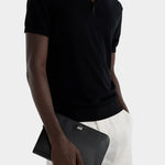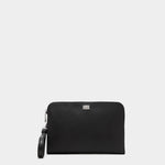 Sicily手拿包選用頂級黑色小牛皮,立體壓紋Logo猶如低語的印記,隨著光影流轉,映照出專屬於你的個性與品味。銀色金屬細節如星辰點綴,為沉穩的外觀添上一抹不經意的光芒,方正結構與簡潔線條。