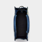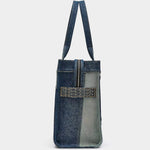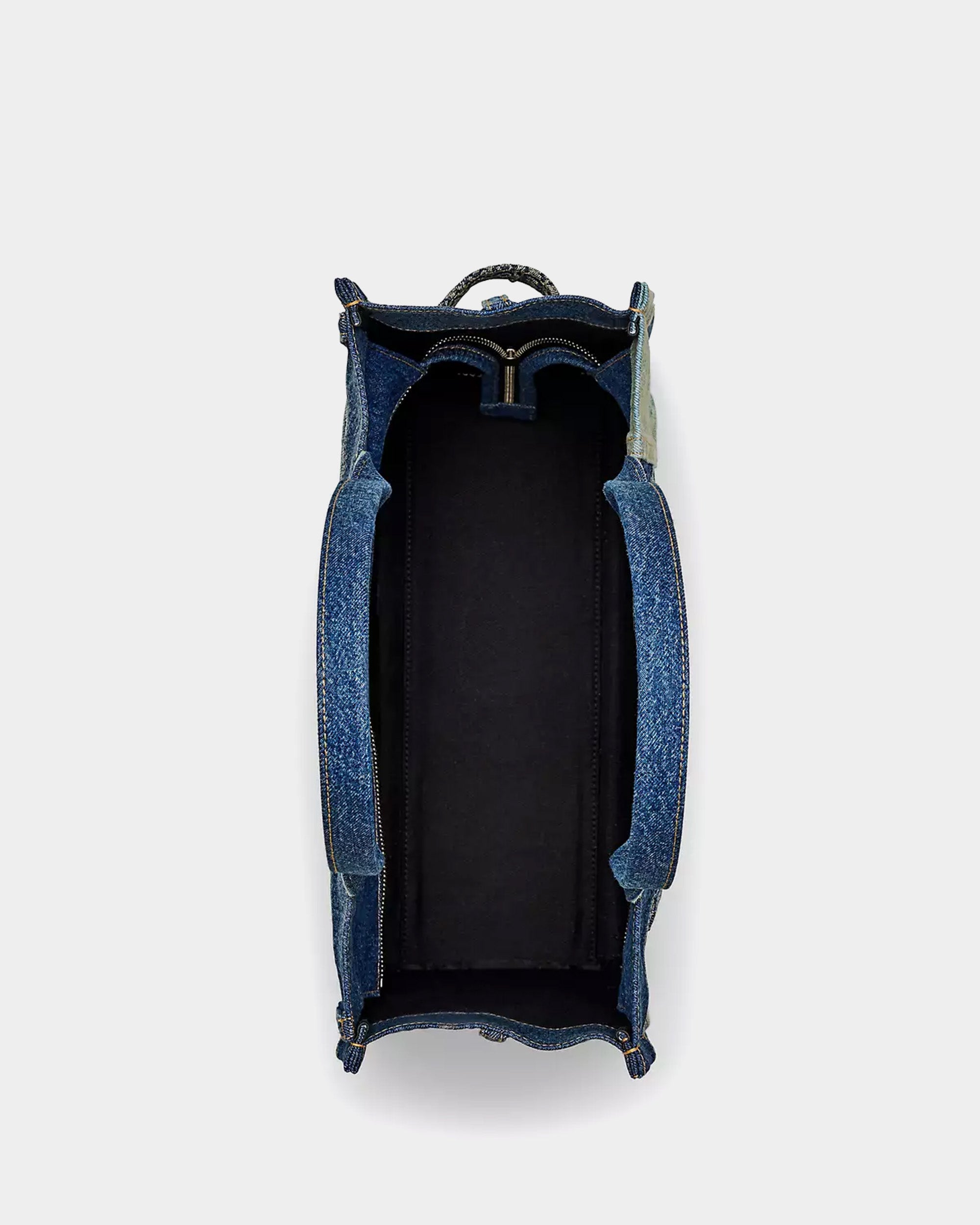 以多重水洗丹寧拼接打造,展現品牌標誌性解構風格。包身採用不同深淺色調牛仔布料拼接組成,結構硬挺,展現復古與工裝元素,容量寬敞,適合工作或短程旅行使用。