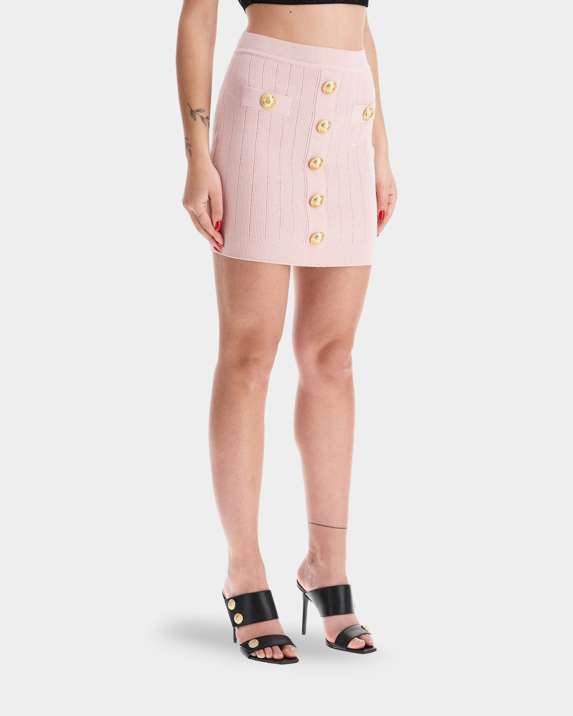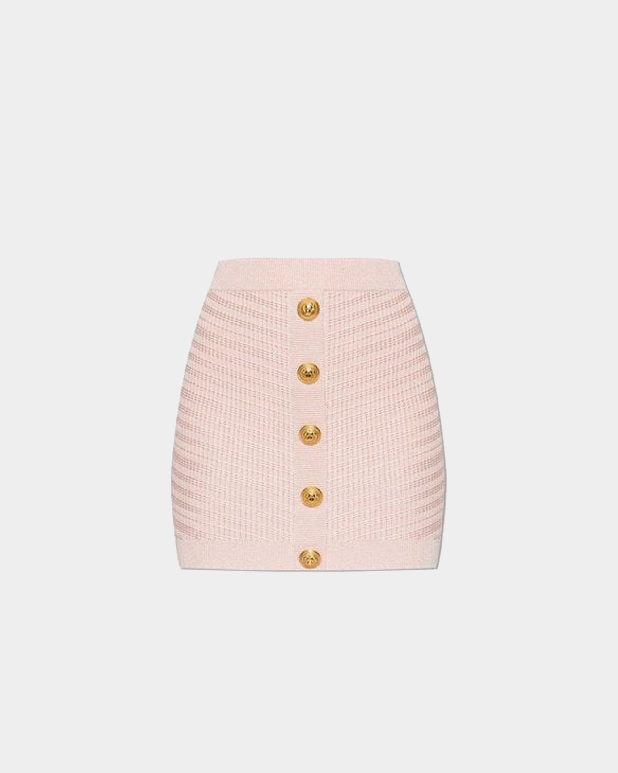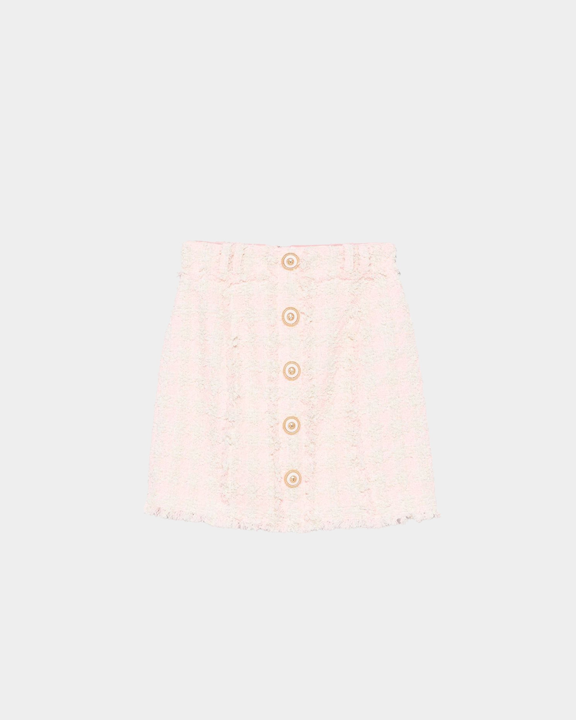 BALMAIN 經典金釦粉色毛高腰A字短裙