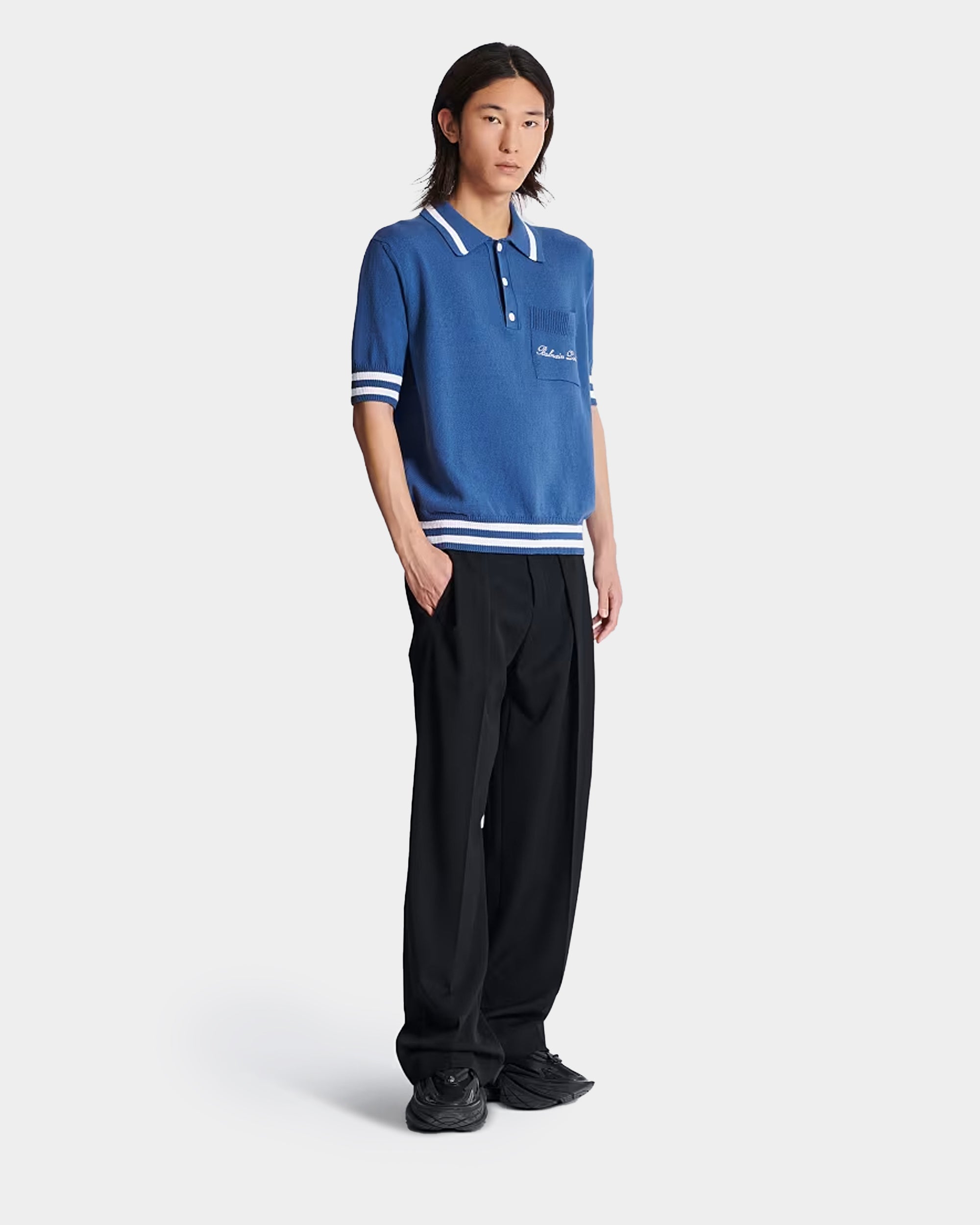 BALMAIN 條紋滾邊刺繡羊毛感 Polo 衫 - 黑