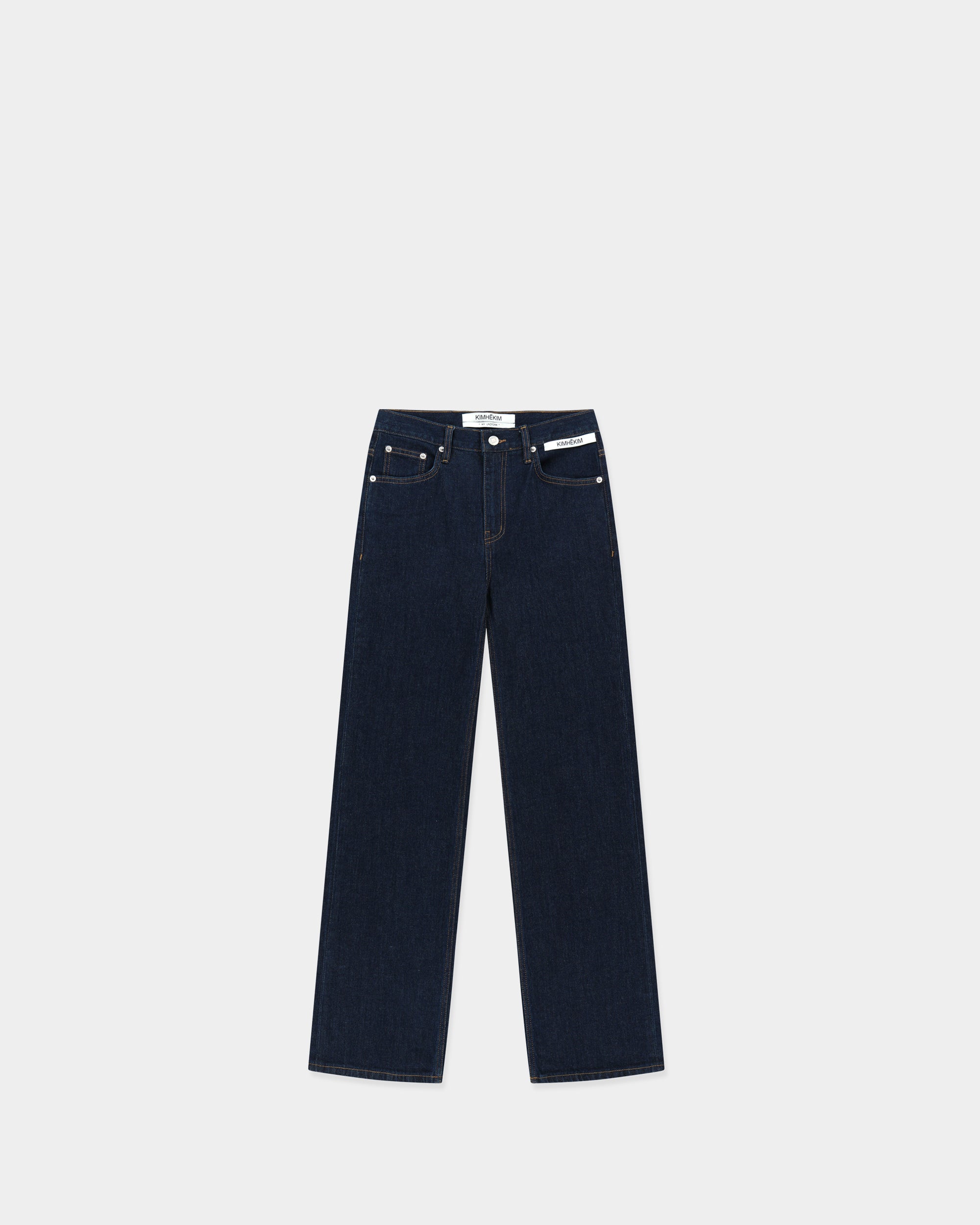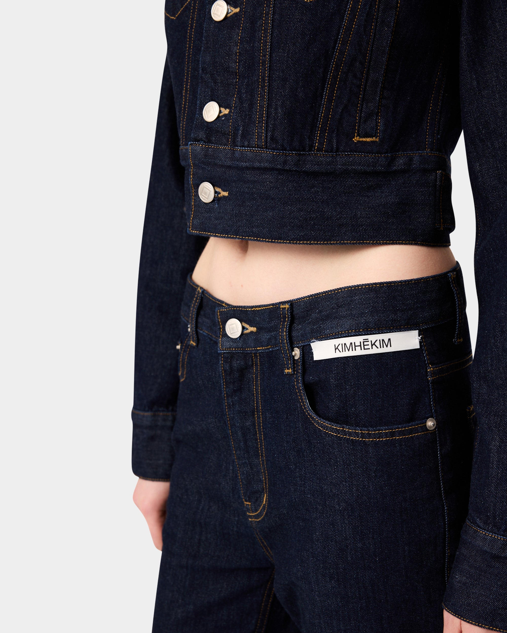 這是對經典工裝的現代冷靜詮釋。捨棄多餘的洗色工藝,純粹依靠面料的挺括度與結構線條,展現 KIMHĒKIM 獨有的裁縫紀律與解構精神。