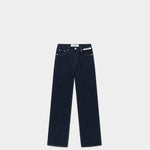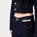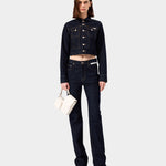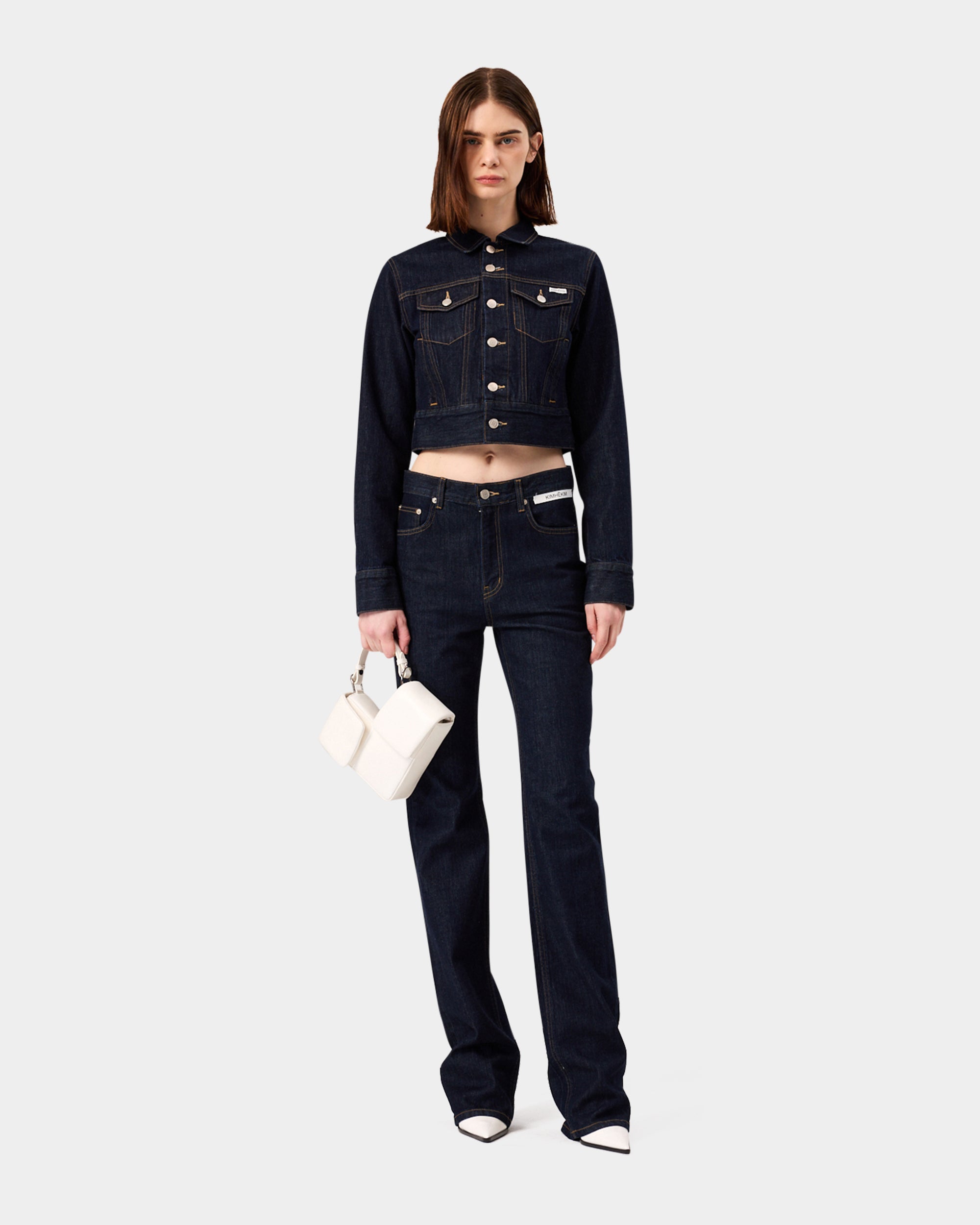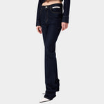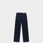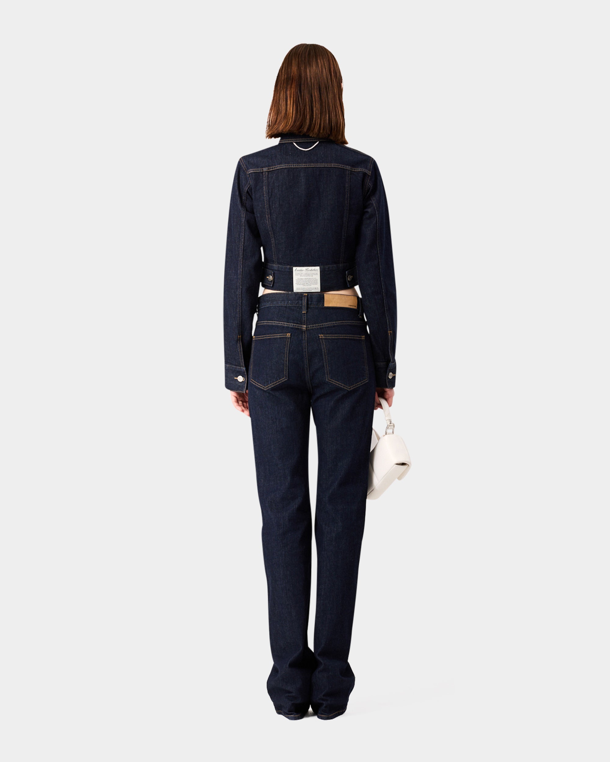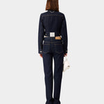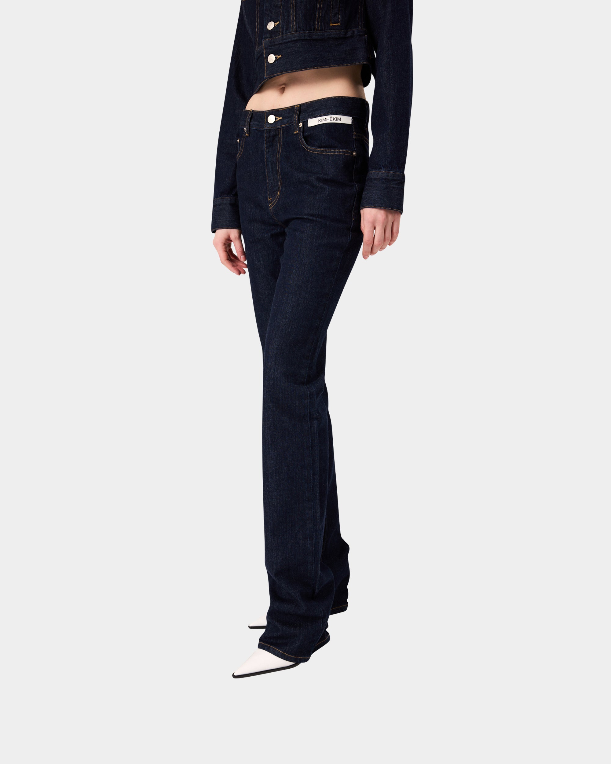 以深邃的原色丹寧建構冷峻的視覺基調。俐落的高腰剪裁延伸至褲腳的微喇叭廓形,在精準的比例算計下重新定義腿部線條。腰間左側口袋處刻意配置品牌識別織標,將服裝背後的實驗室標籤轉化為外顯的裝飾細節,與深色面料形成鮮明的色彩對比。