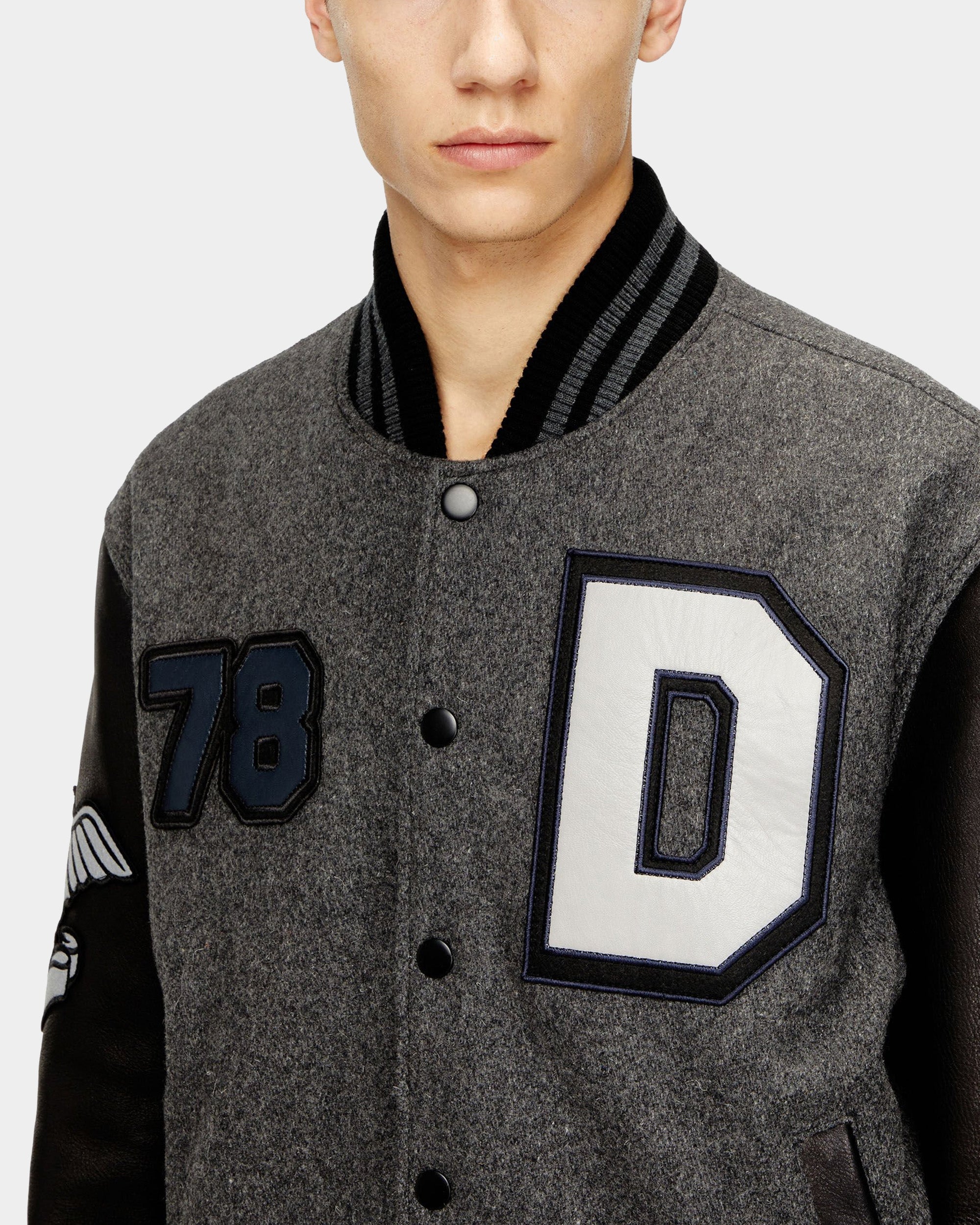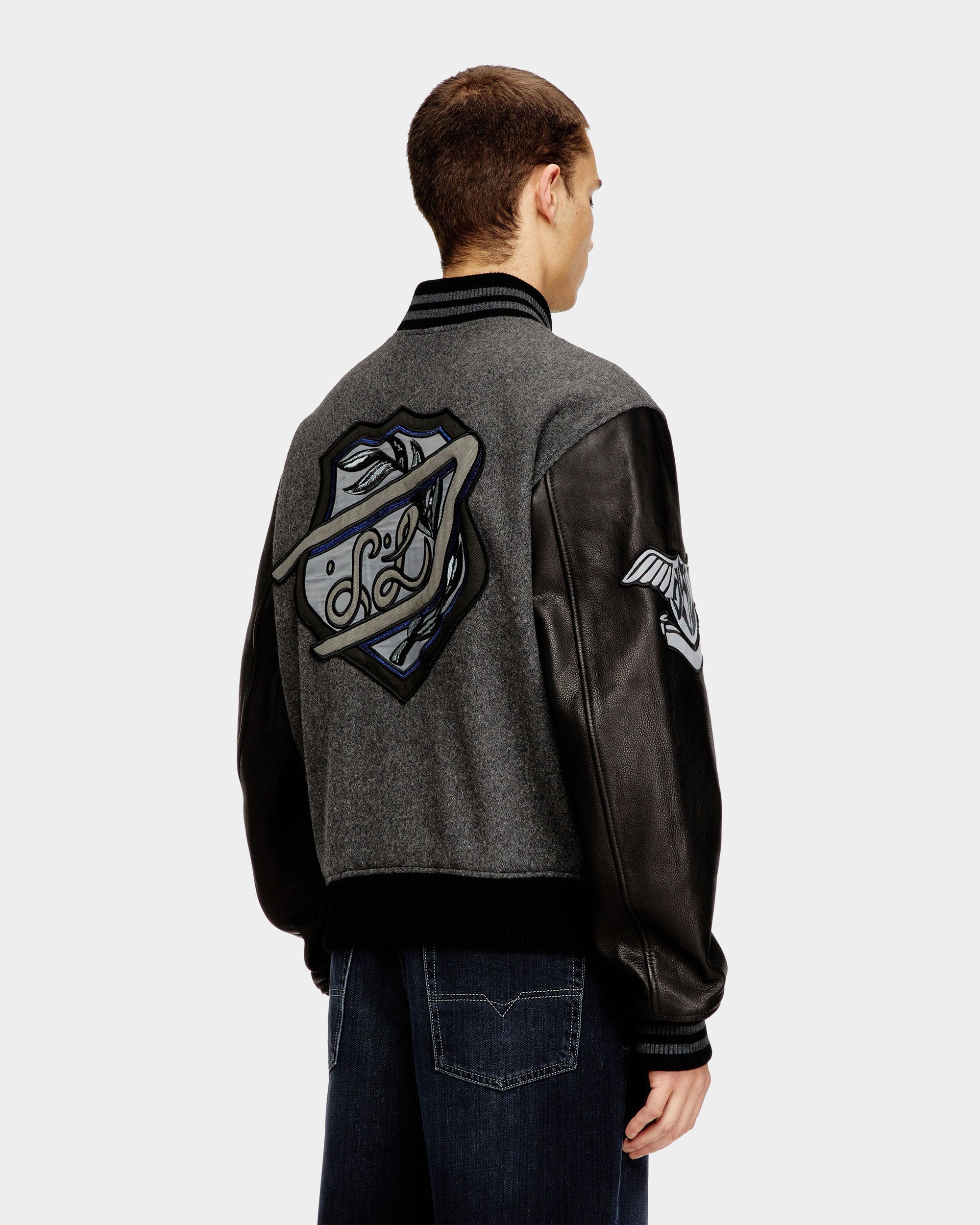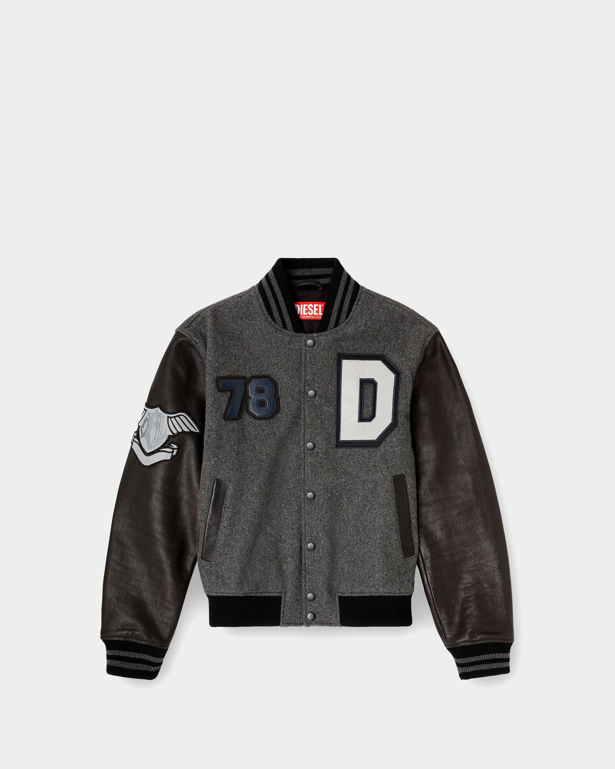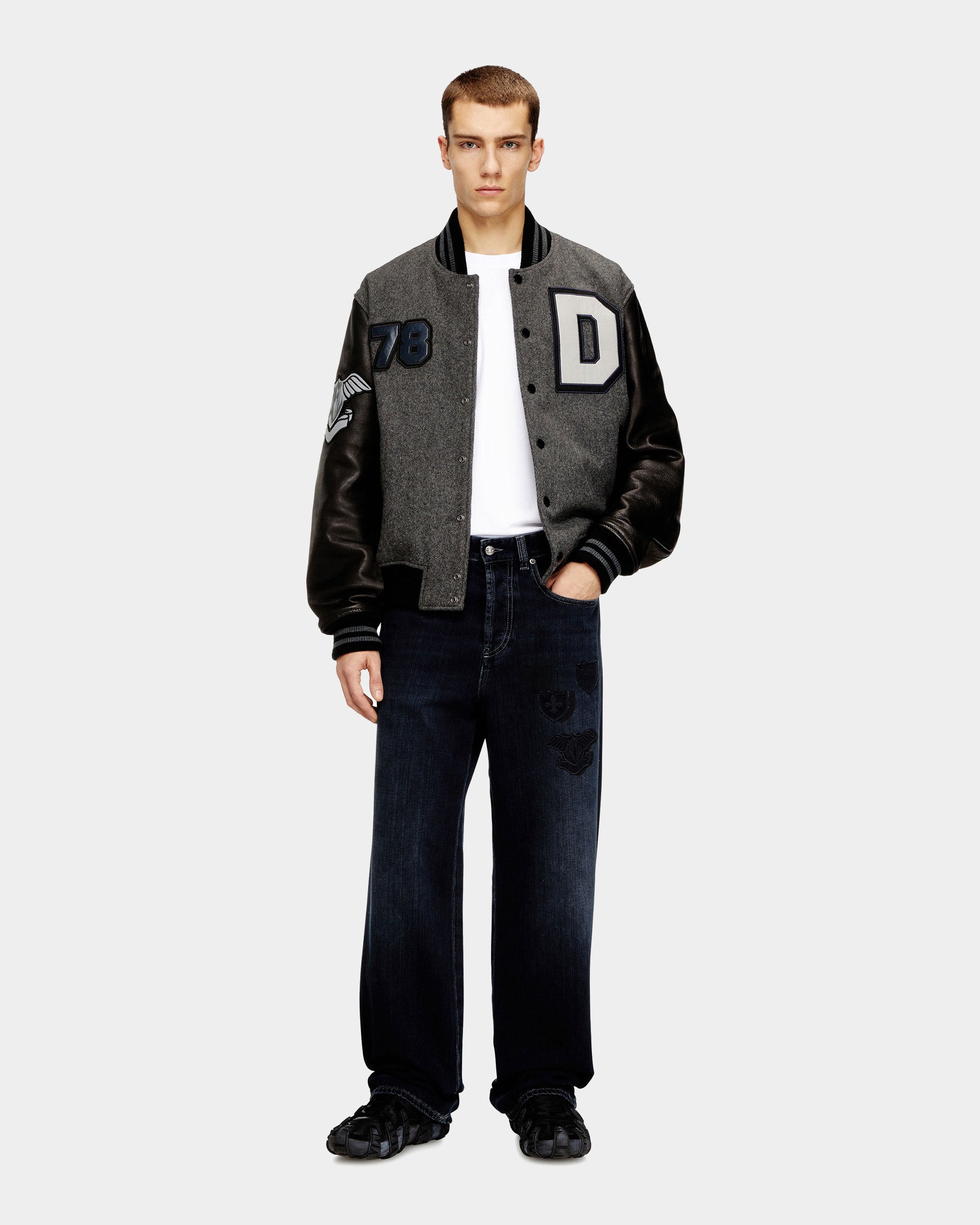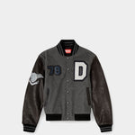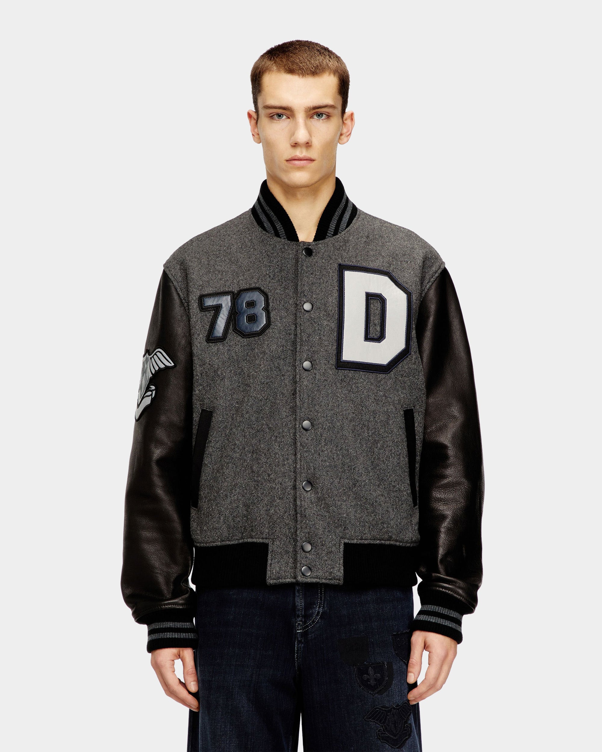 此款男裝棒球外套以經典校隊風格為靈感,採用羊毛與皮革拼接製成,結合復古與街頭氣息。前後與單側袖身點綴多款刺繡與品牌拼貼,層次豐富且辨識度高。內裡選用鋪棉緞面材質,提升保暖與舒適度,搭配略短版剪裁,展現俐落有型的輪廓。