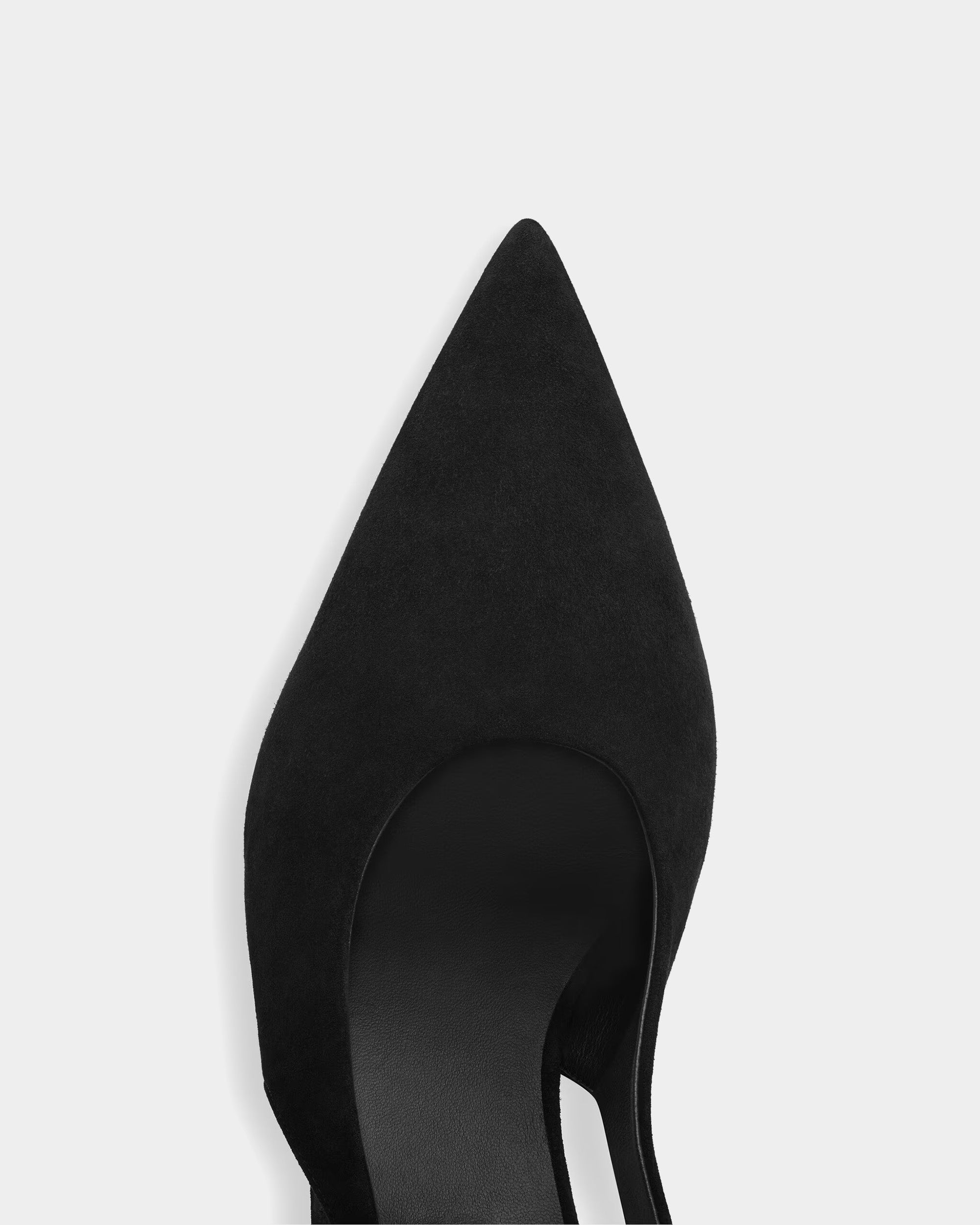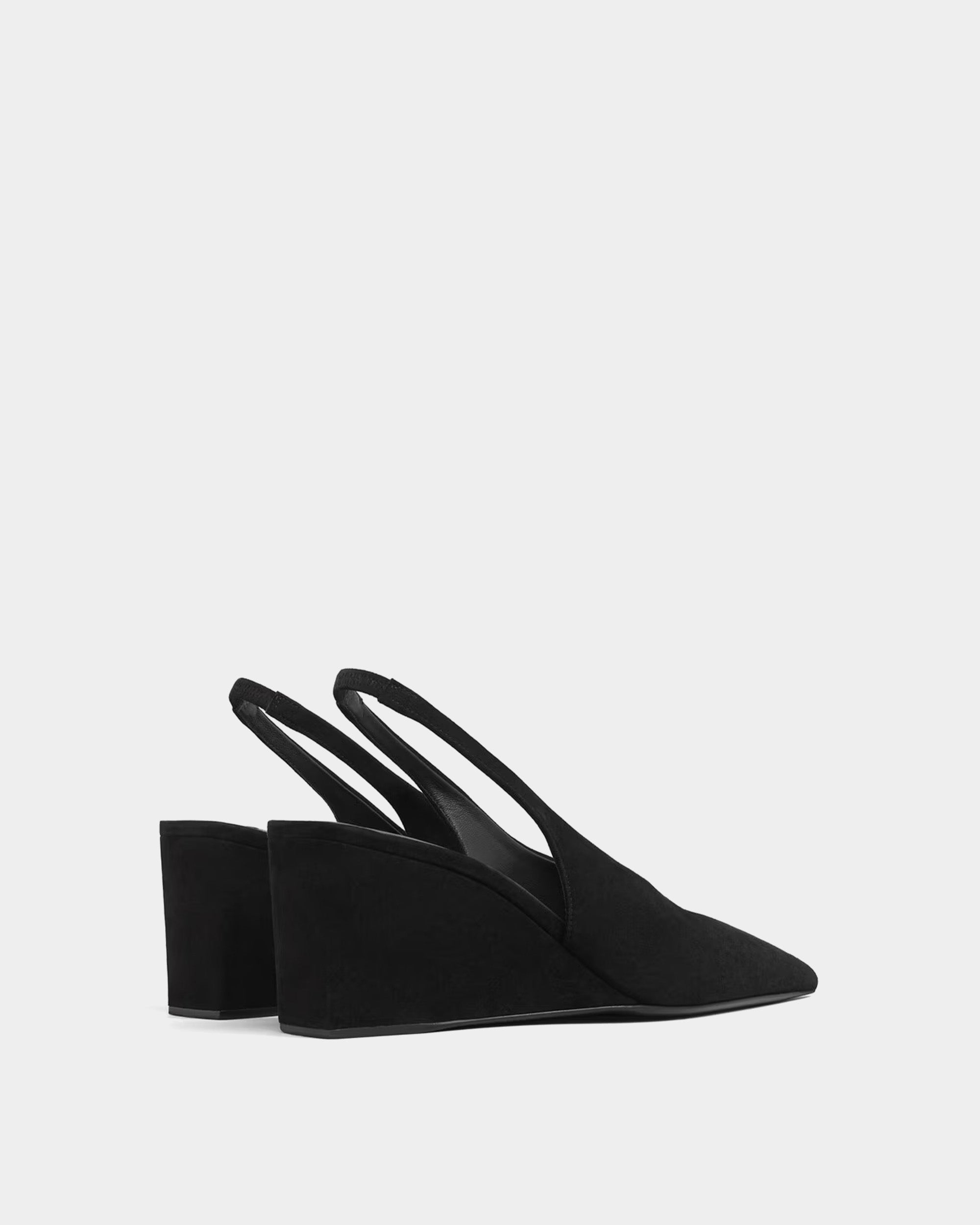 延續品牌標誌性的現代建築美學,以頂級麂皮打造洗鍊的尖頭廓形。獨特的幾何立方楔型跟結構,不僅提供穩定的支撐力,更賦予鞋身極具辨識度的側面線條。優雅的後繫帶設計完美修飾腳踝曲線,結合經典沉穩的曜石黑麂皮質感,在簡約中展現不凡的法式高級感,是日常職場與晚宴皆能勝任的百搭單品。