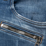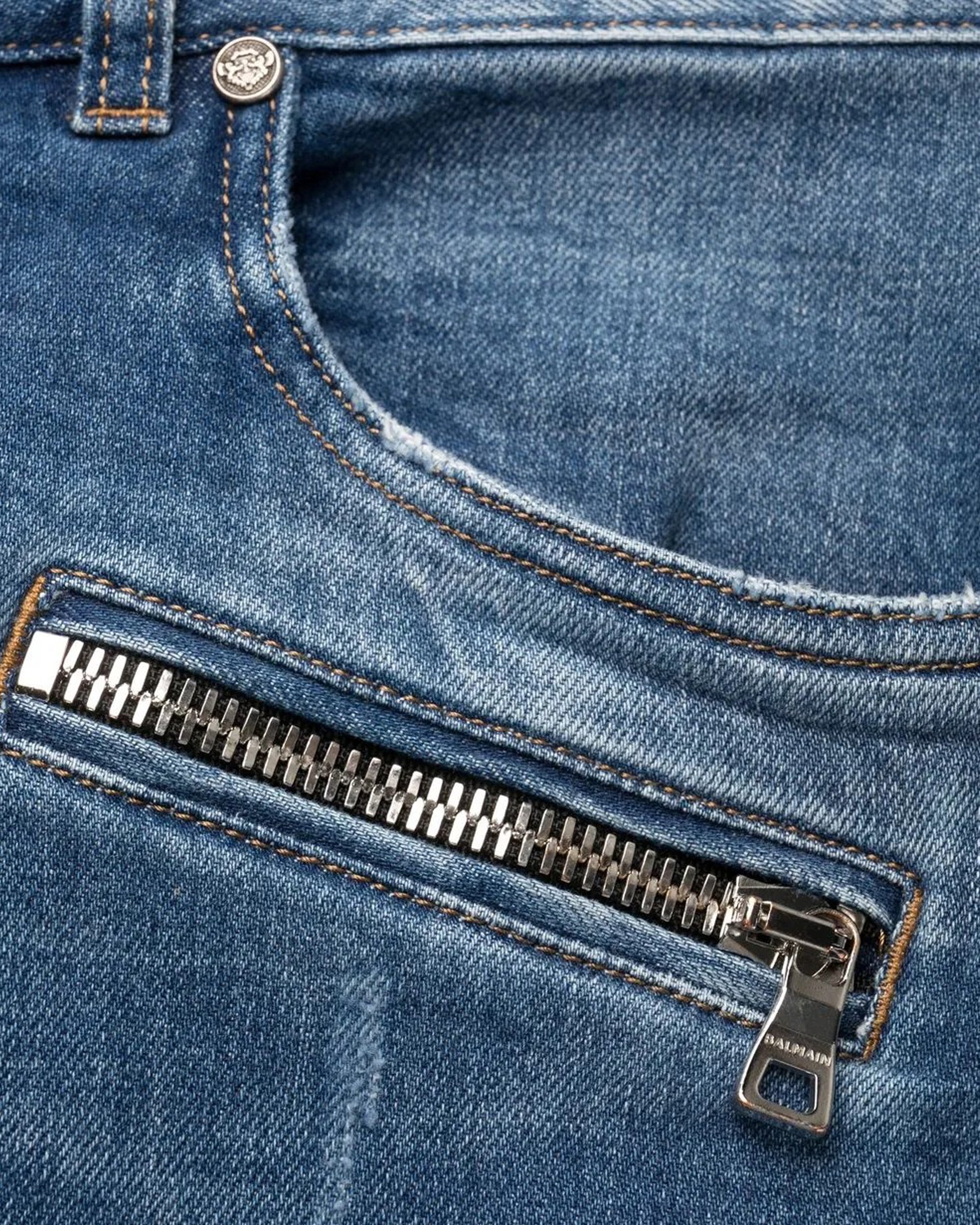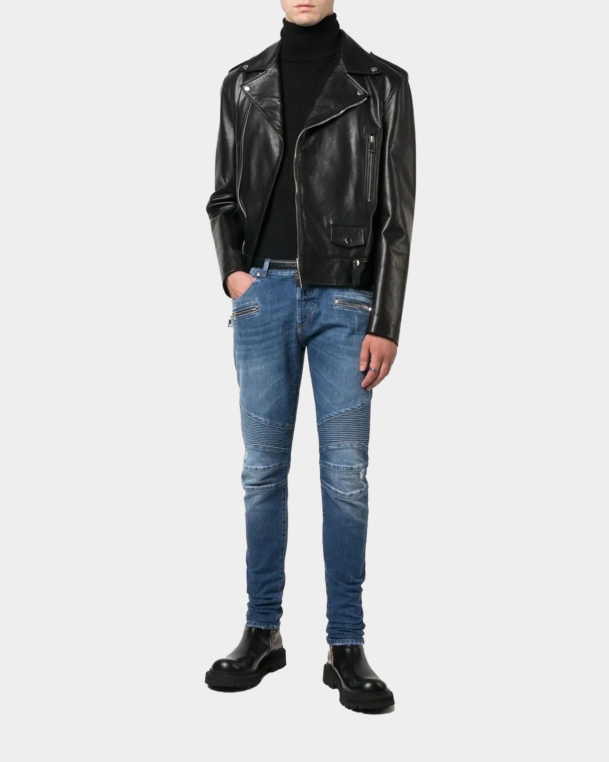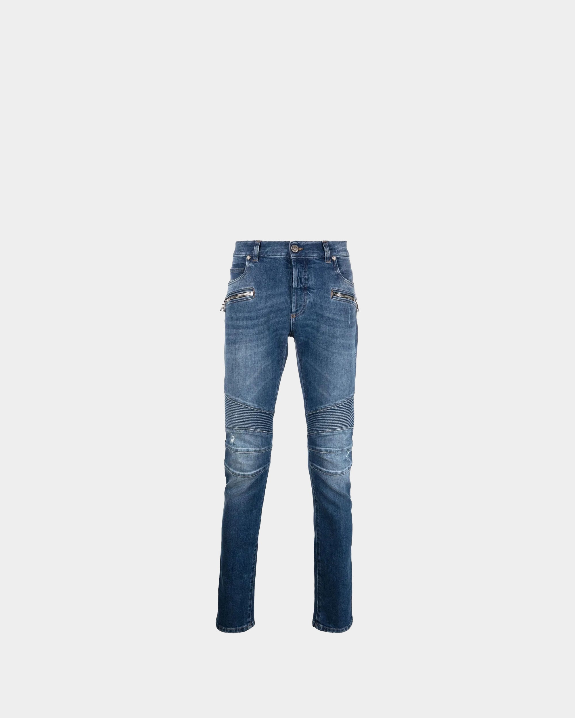 Balmain's Biker Distressed Skinny Jeans are a signature piece of the brand, combining moto style with high fashion. Cut for a slim fit, these jeans are made from a high-quality cotton blend with elastane for comfort. They feature classic ribbed panels, zip pockets and distressed details for a rugged, edgy look. Made in Japan, these jeans are crafted with refined details and pair well with a knit sweater or shirt for a modern, contemporary look.