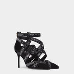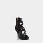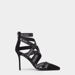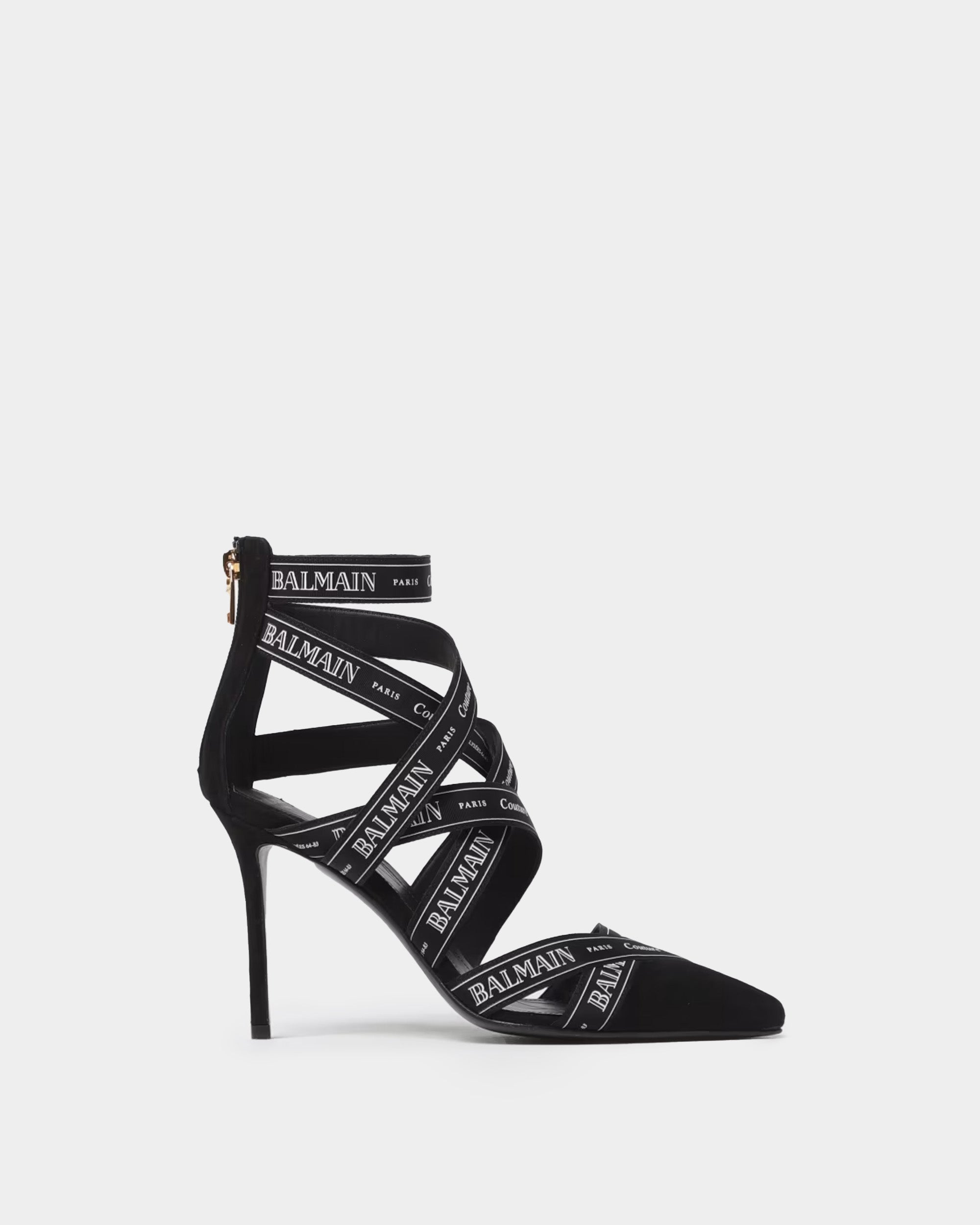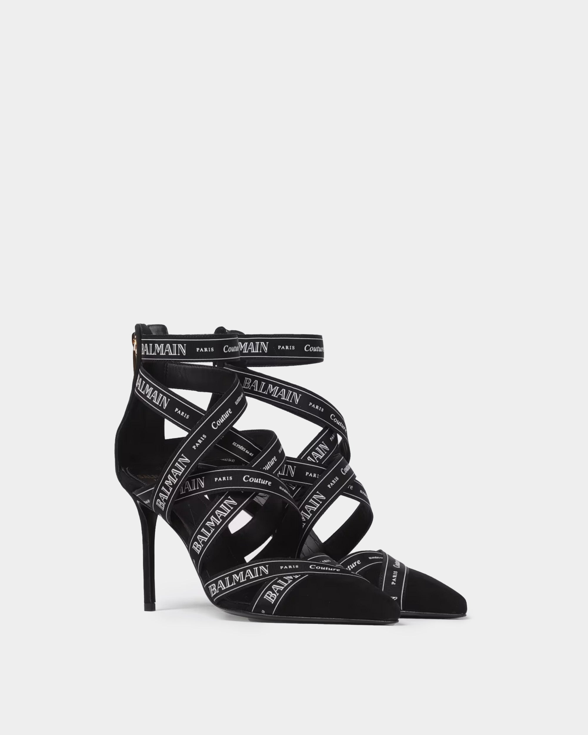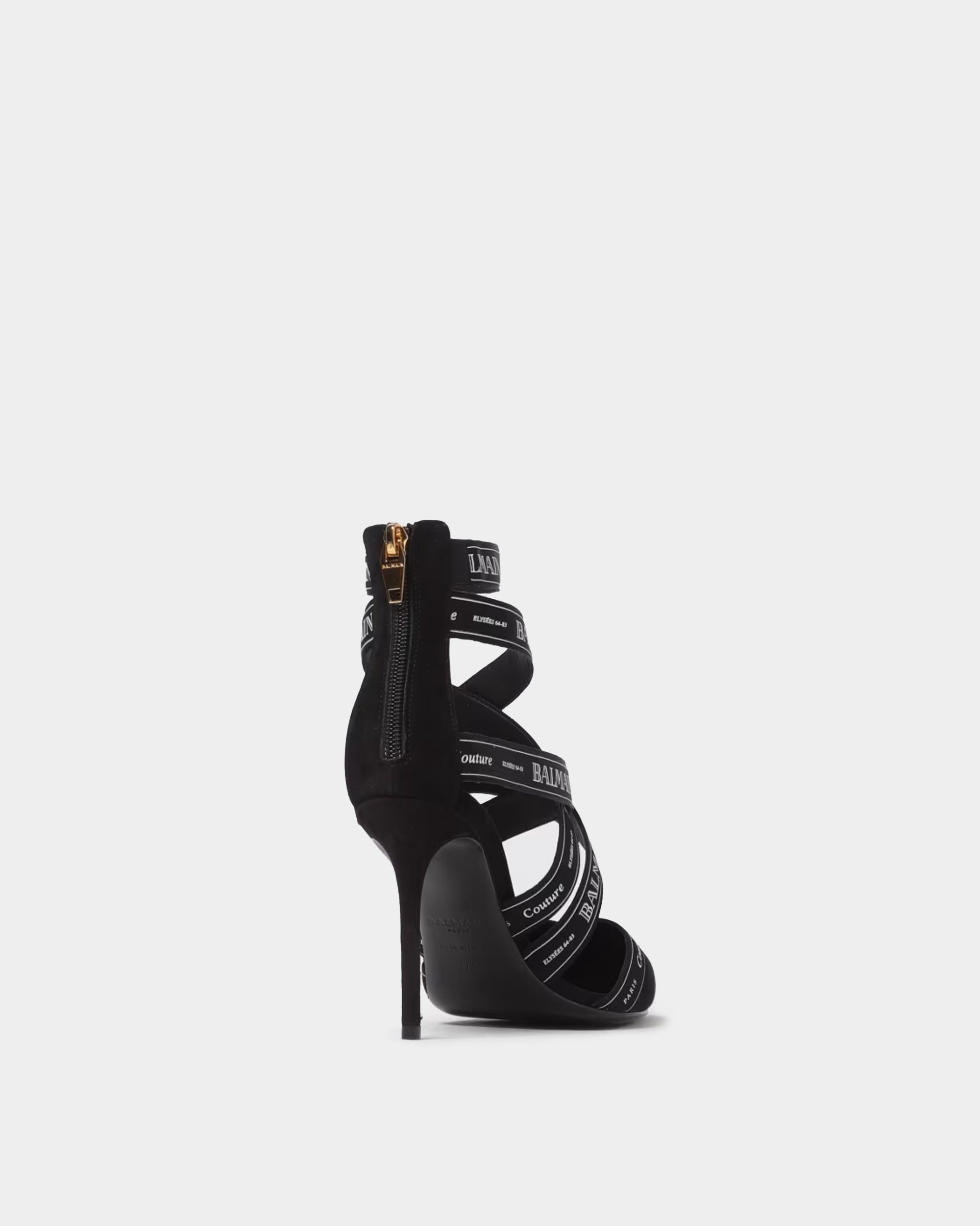 Balmain high-heeled sandals combine the brand's classic iconic ribbon with an architectural shoe design, showing the tension and structural beauty of Parisian fashion. The multi-layered elastic ribbon tightly wraps the instep and ankle, paired with a metal zipper on the back and a stiletto heel, showing the feminine charm of haute couture, an eye-catching highlight for parties, fashion events or personalized formal wear.