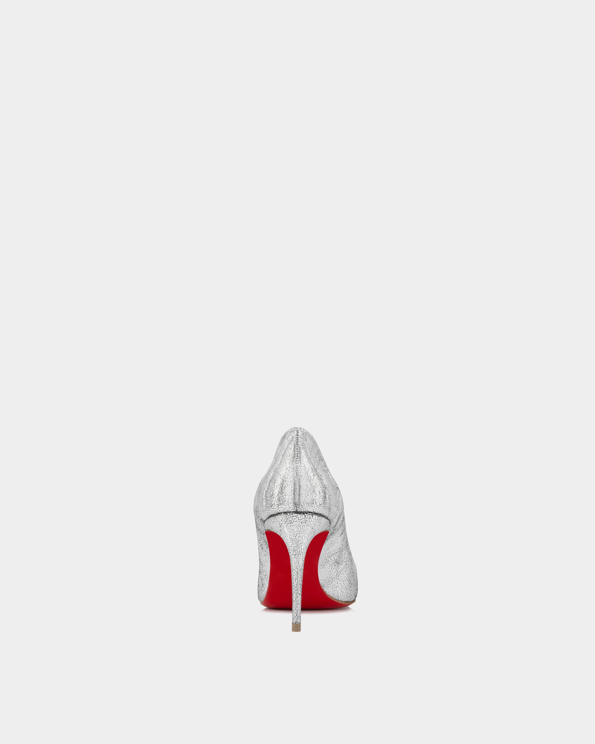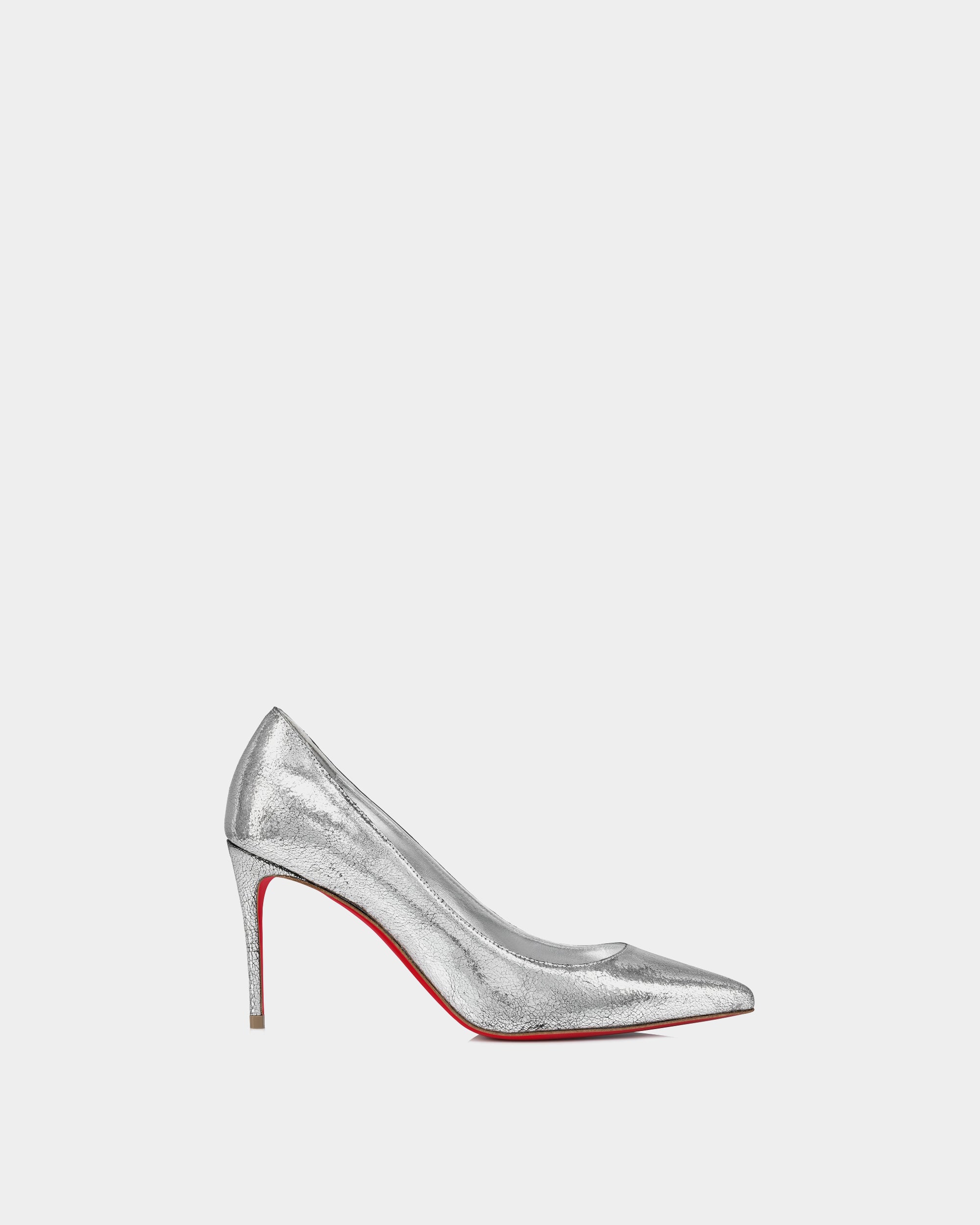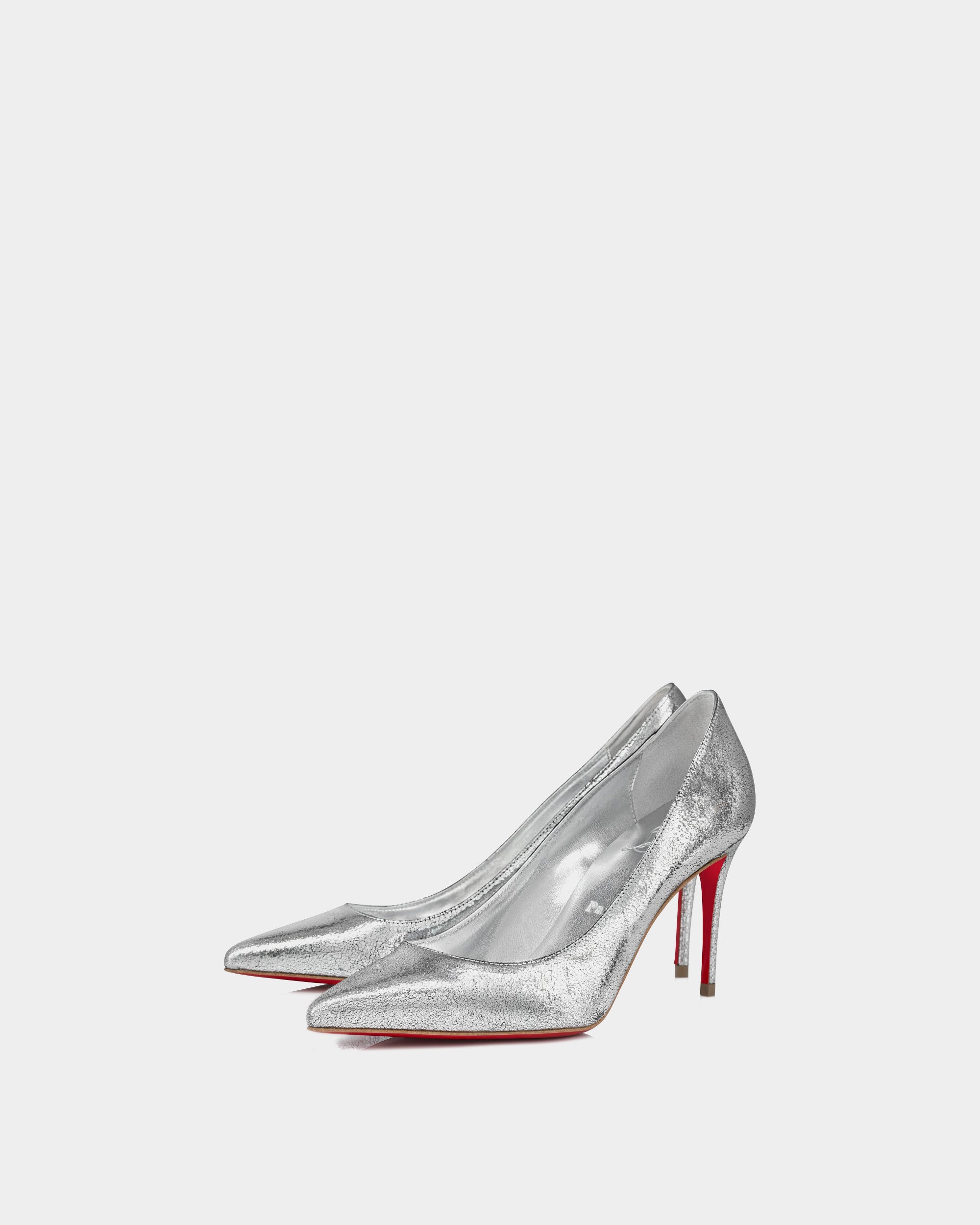 The classic Kate 85mm style combines elegant lines with a practical height, perfect for long days at formal events or daily commuting. The stylish and elegant Kate pumps are transformed into shiny silver leather, which makes people shine. With a classic pointed toe and a thin 85mm heel, this fashionable and evergreen pump elegantly sets off the foot. The shiny laminated leather upper forms a charming contrast with the classic Loubi red sole, making every step more extraordinary.