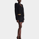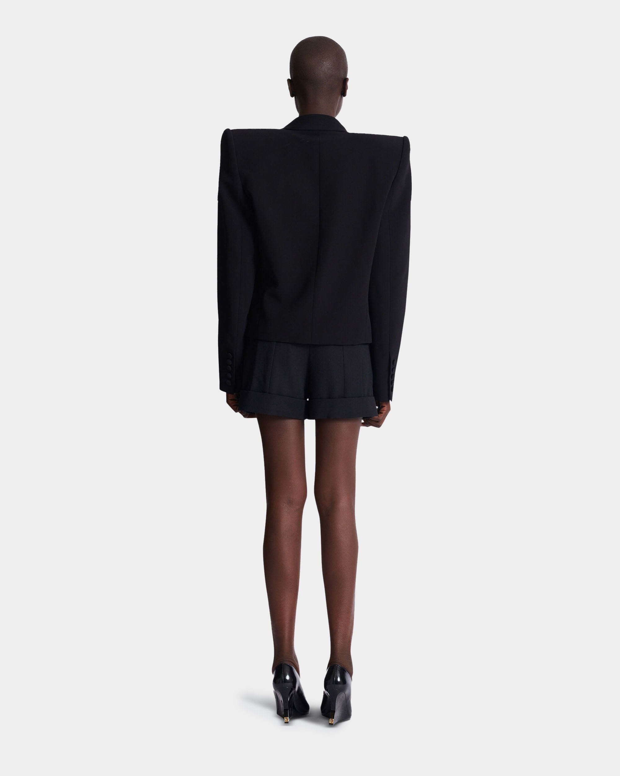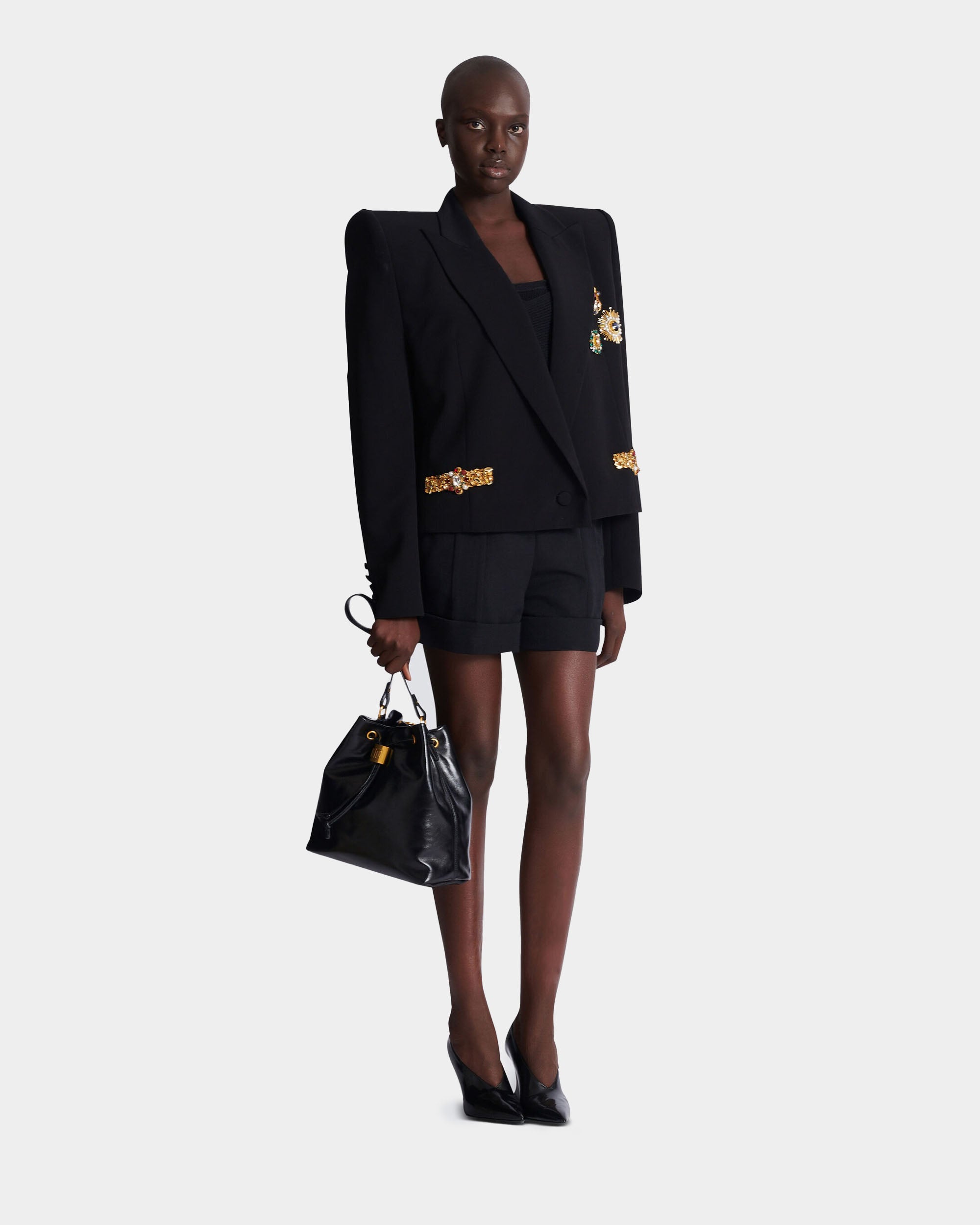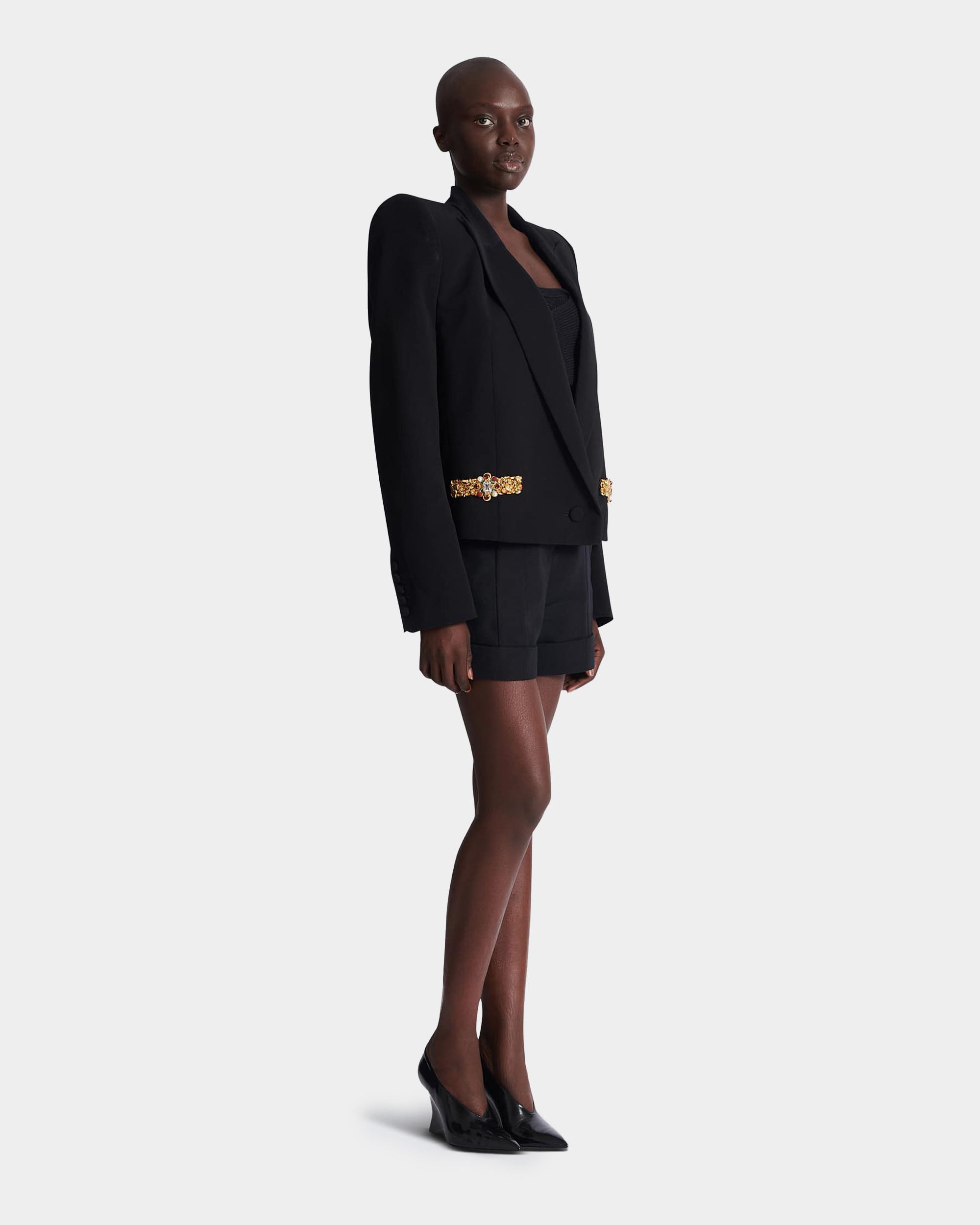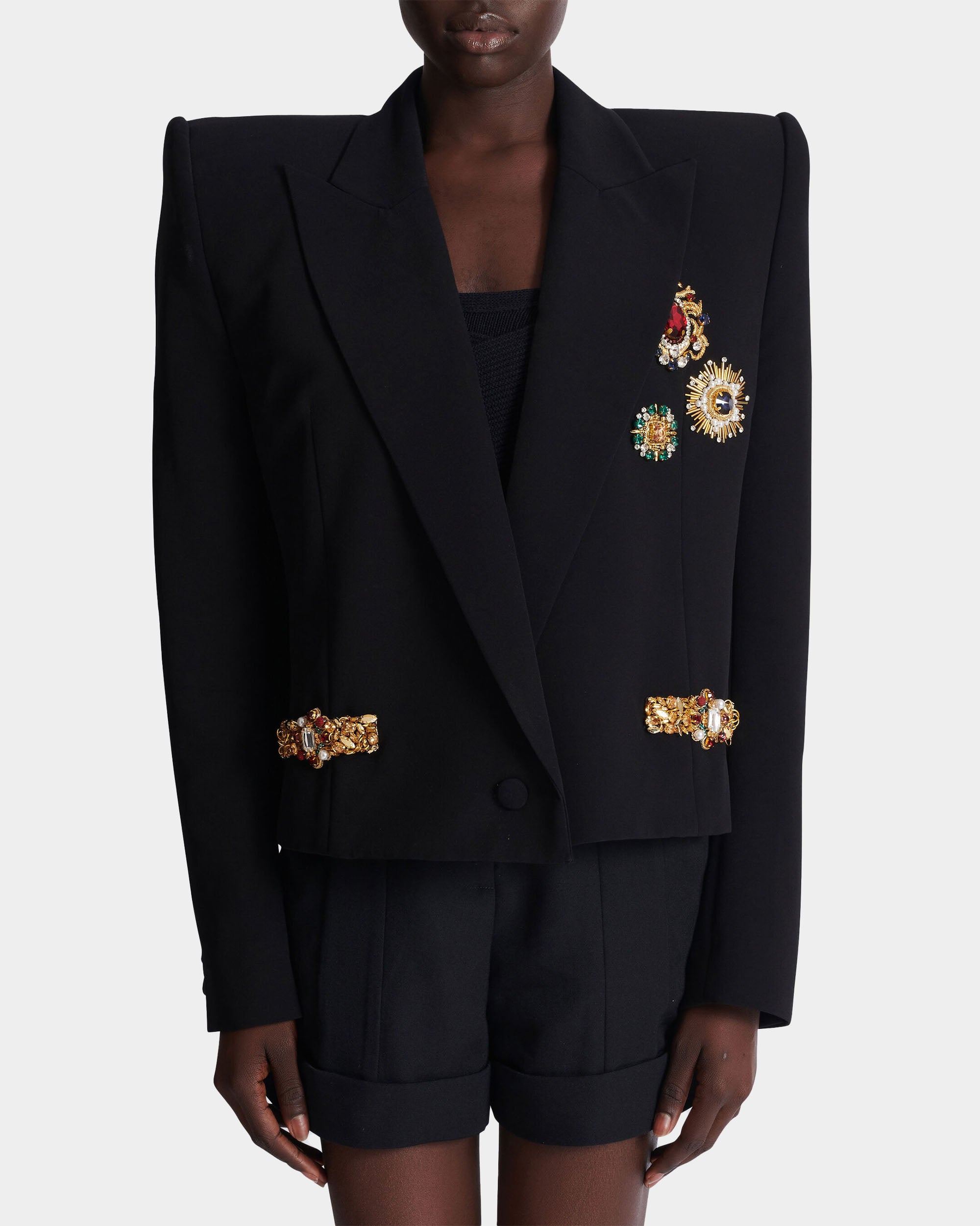 此款短版刺繡外套以俐落剪裁與精緻細節展現現代優雅風格。採用義式訂製翻領設計與結構感肩線,塑造立體而鮮明的輪廓;胸前口袋與單顆鈕扣開合增添經典元素。整體以輕盈黏膠纖維面料製作,觸感柔順並保有良好垂墜感,搭配及腰短版剪裁,能輕鬆融入多種造型,展現精緻且自信的時尚氣息。