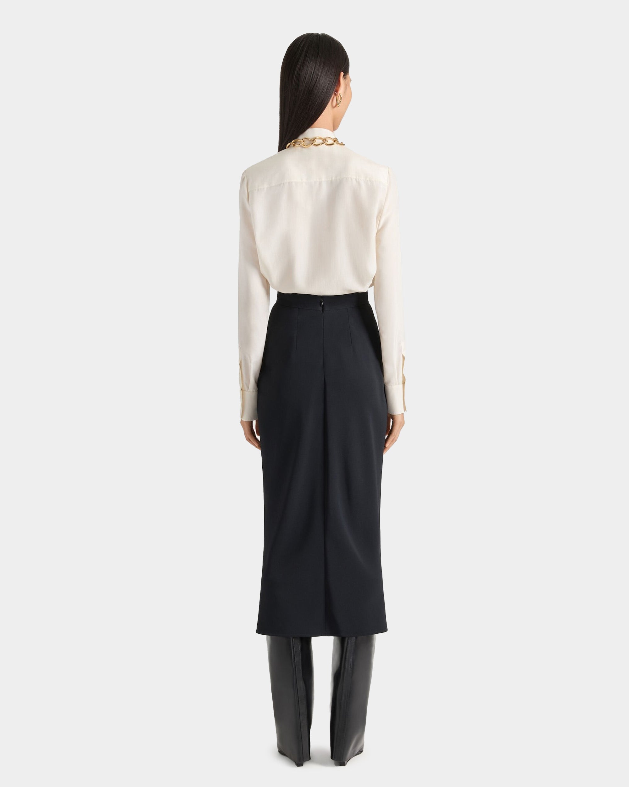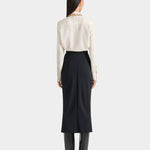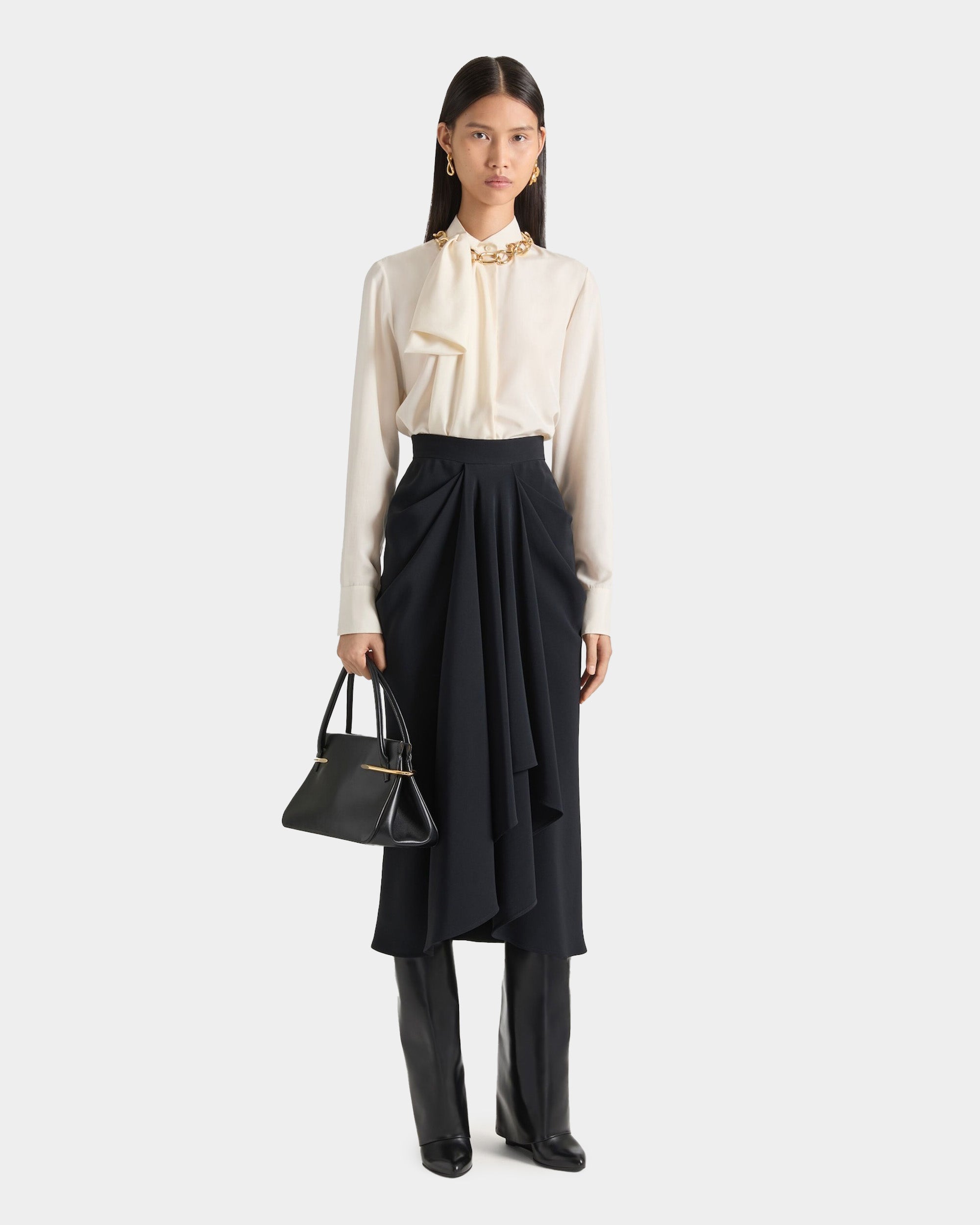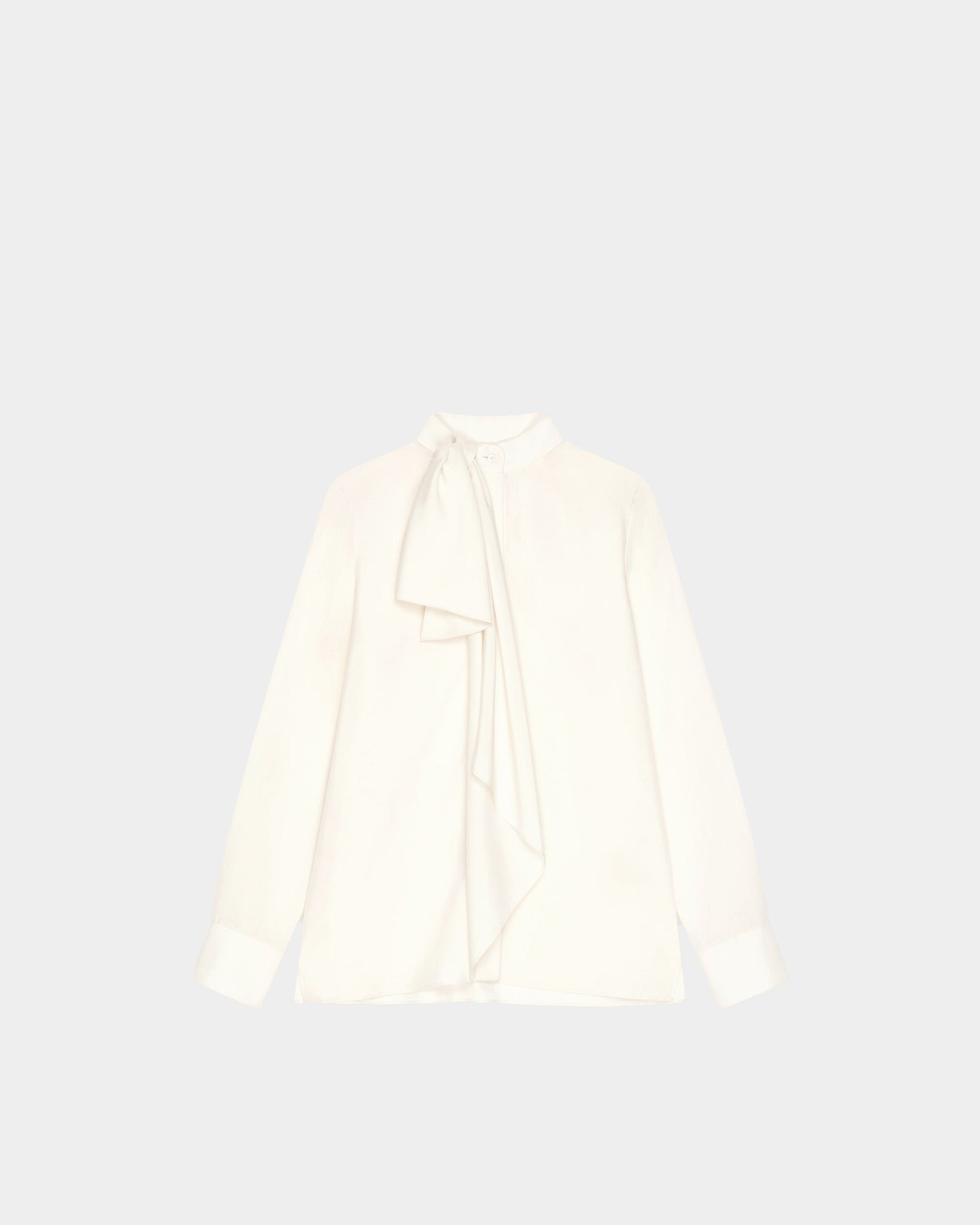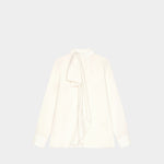 這款 Givenchy 淡色長袖襯衫採用高質感絲質面料精製而成,中式立領配上寬大蝴蝶結裝飾,增添優雅與設計感;前襟為隱藏式鈕扣開合設計,袖口搭配按鈕細節,整體剪裁俐落又具女性柔美氣質。