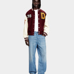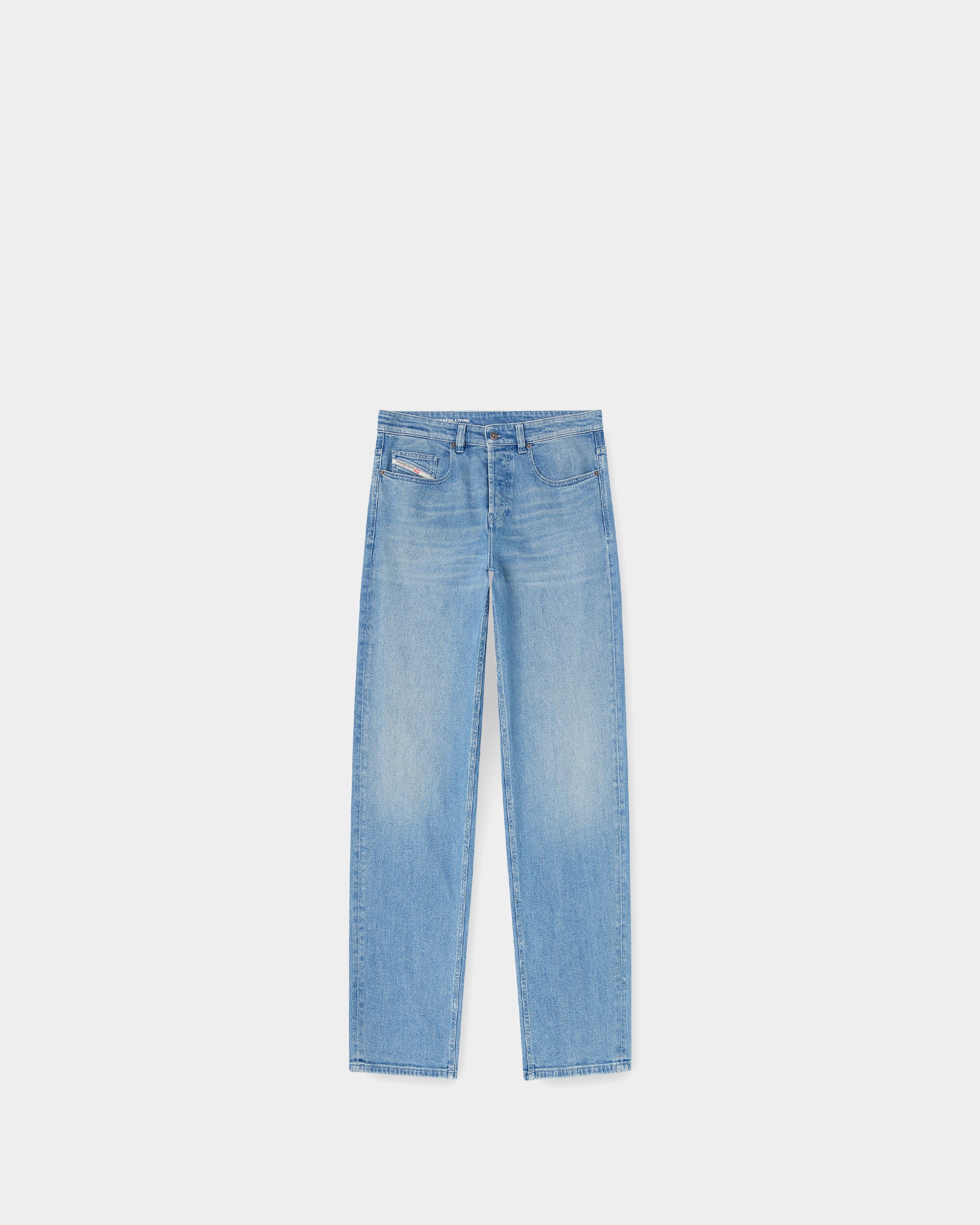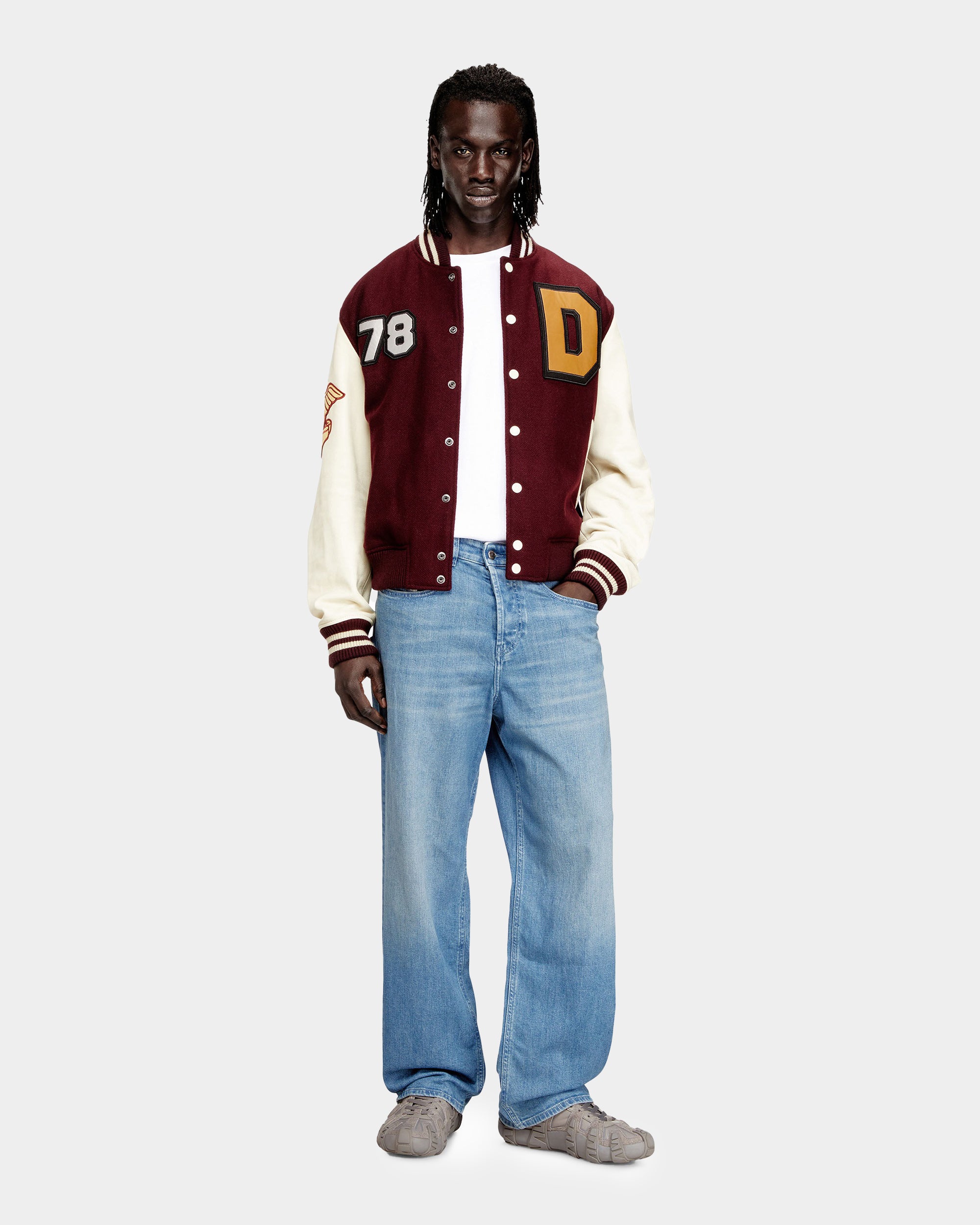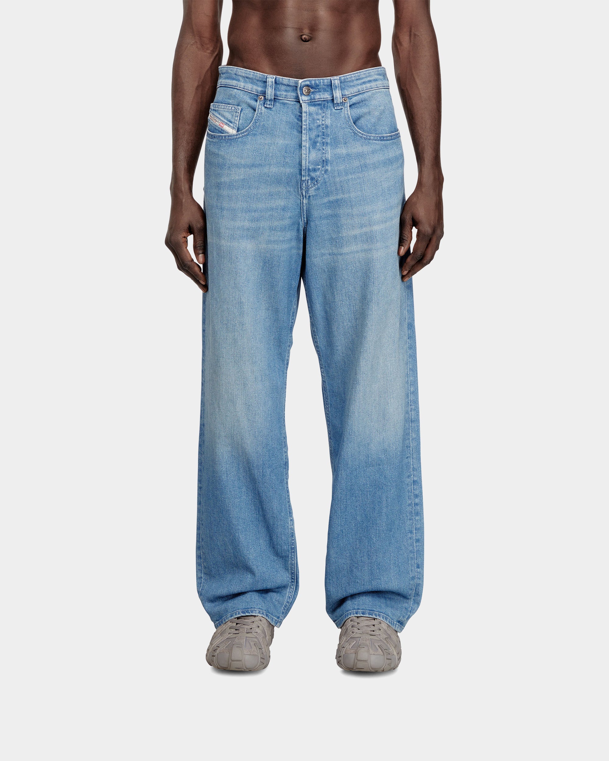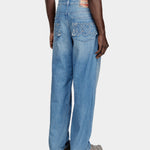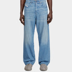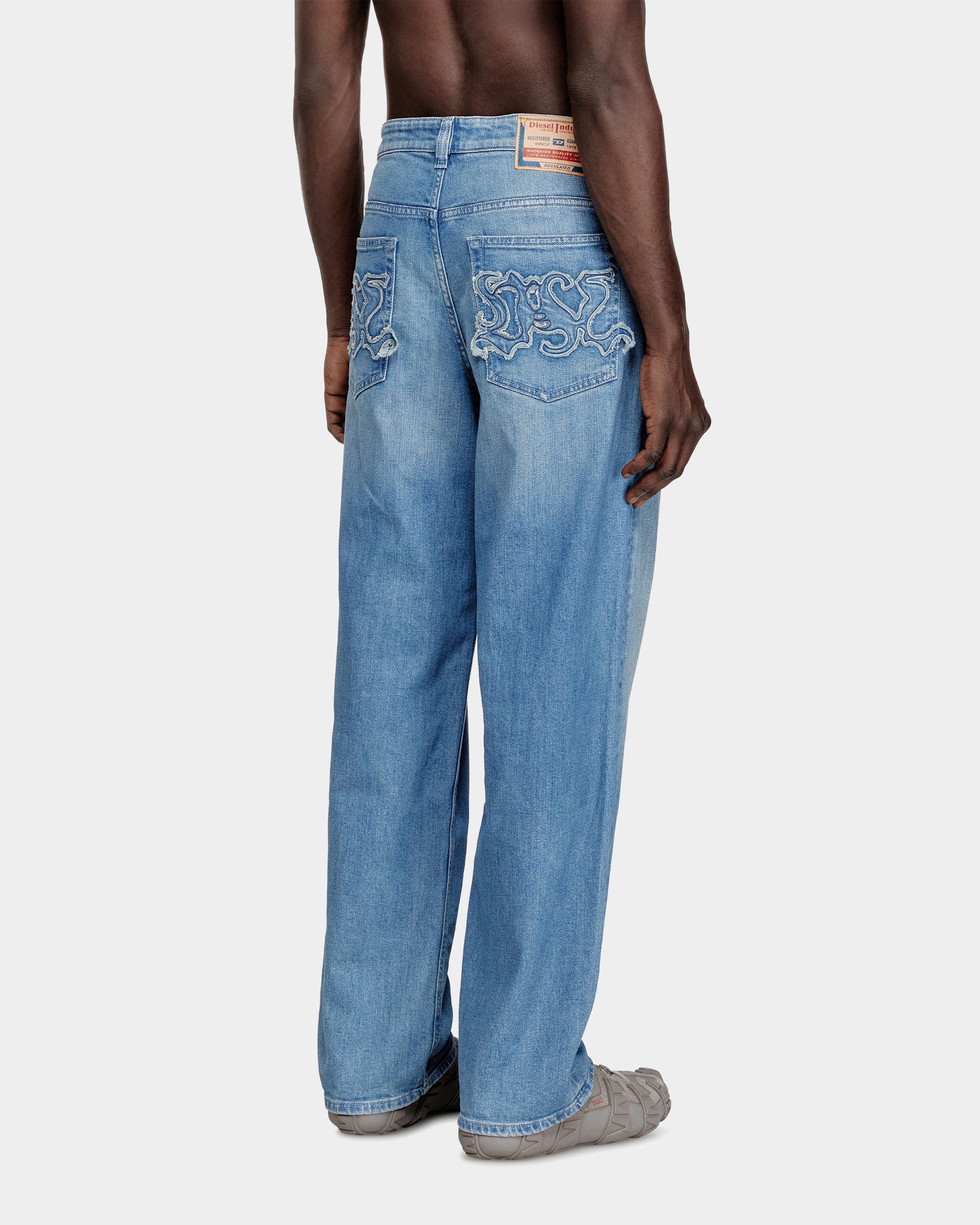 此款男裝牛仔褲以寬鬆長版剪裁打造鮮明街頭輪廓,低腰與低襠設計搭配寬褲管,展現隨性不羈的風格。採用中藍色固定牛仔布製成,前側點綴細緻水鑽裝飾,營造低調閃耀效果;後口袋搭配刺繡拼布設計,為整體造型增添個性亮點。